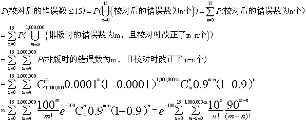 1. 一本书共有1,000,000个印刷符号, 排版时每个符号被排错的概率为0.0001, 校对时每个排版错误被改正的概率为0.9, 求在校对后错误不多于15个的概率.
