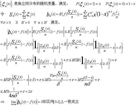 10. 用概率方法证明如下Weierstrass定理:对区间[0,1]上任何连续函数f(x), 必存在多项式序列{bn(x)}, 使在区间[0,1]上一致地有bn(x) → f(x).