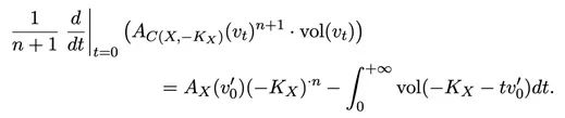 (李驰老师注:这是发表在Duke Mathematical Journal的一篇文章中得到的一个公式。该公式左边是仿射锥上normalized volume的导数,而右边量的非负条件则刻画了Fano流形X的K-semistability。)