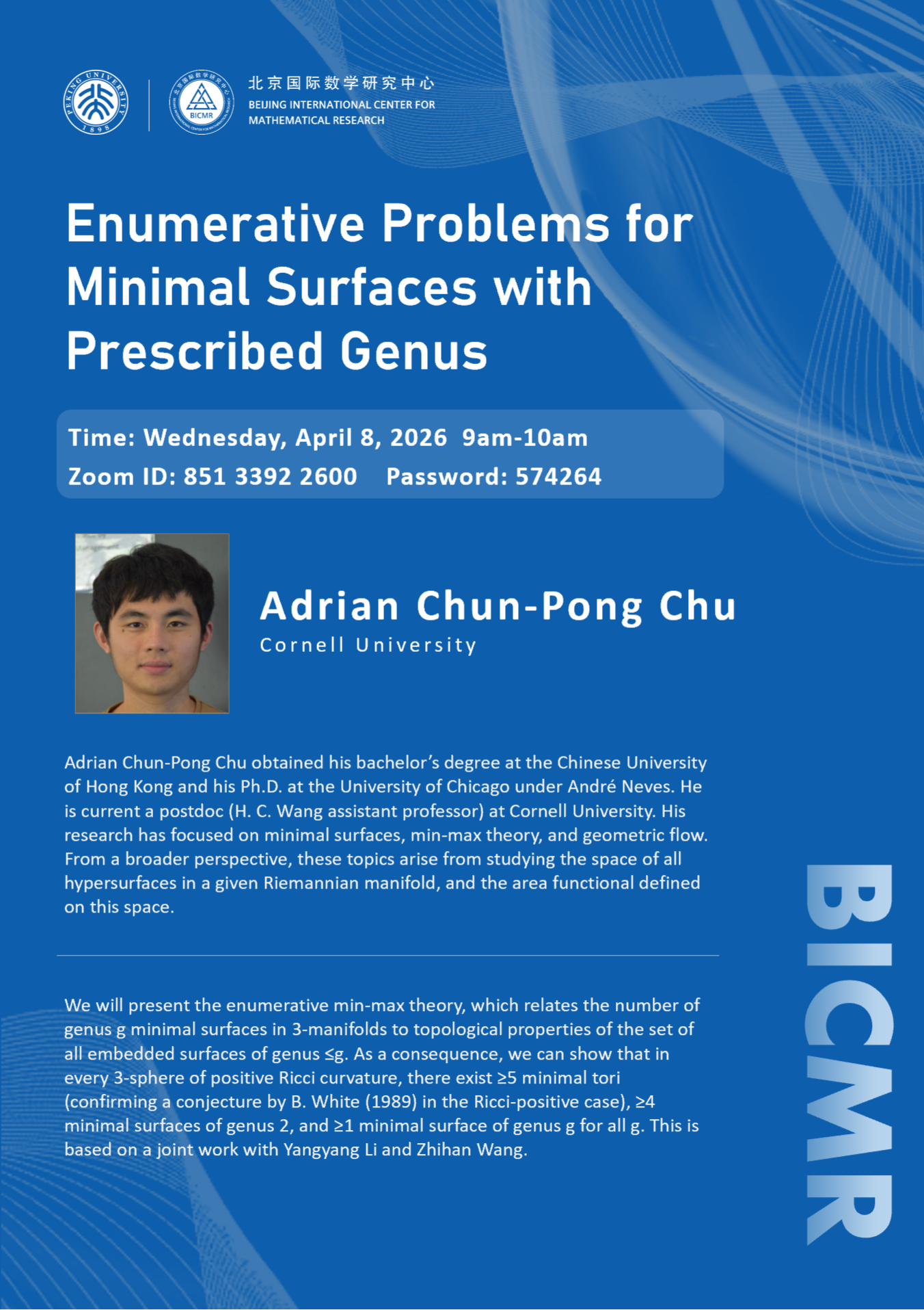 Adrian Chun-Pong Chu obtained his bachelor's degree at the Chinese University of Hong Kong and his Ph.D. at the University of Chicago under André Neves. He is currently a postdoc (H. C. Wang assistant professor) at Cornell University. His research has focused on minimal surfaces, min-max theory, and geometric flow. From a broader perspective, these topics arise from studying the space of all hypersurfaces in a given Riemannian manifold, and the area functional defined on this space.