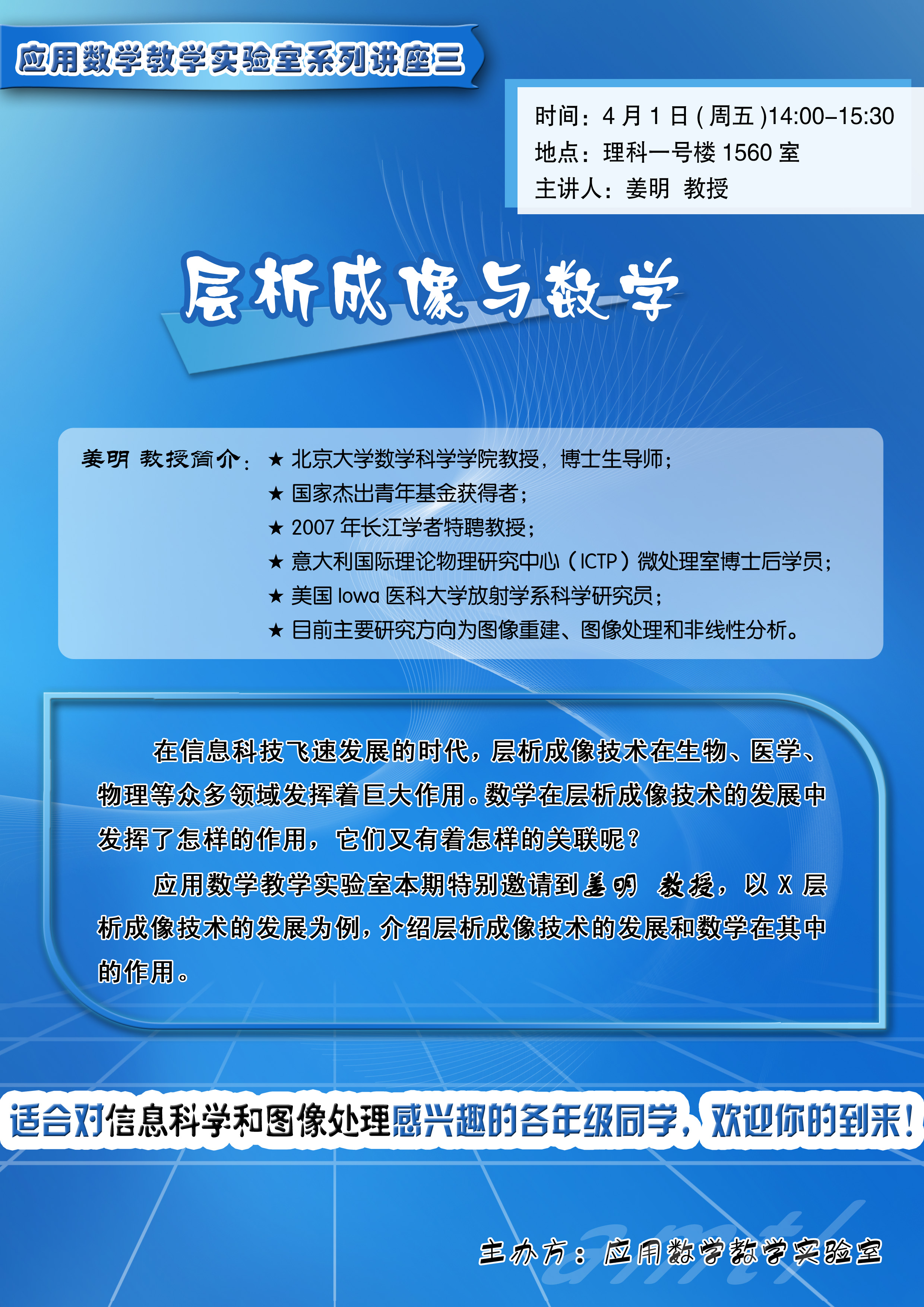 应用数学教学实验室本期特别邀请到姜明 教授,以X层析成像技术的发展为例,介绍层析成像技术的发展和数学在其中的