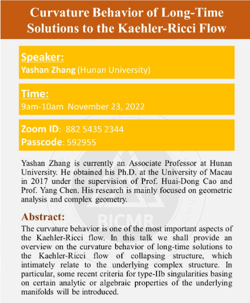 Speaker: Yashan Zhang is currently an Associate Professor at Hunan University. He obtained his Ph.D. at the University of Macau in 2017 under the supervision of Prof. Huai-Dong Cao and Prof. Yang Chen. His research is mainly focused on geometric analysis and complex geometry.