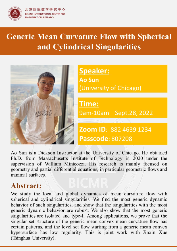 Ao Sun is a Dickson Instructor at the University of Chicago. He obtained Ph.D. from Massachusetts Institute of Technology in 2020 under the supervision of William Minicozzi. His research is mainly focused on geometry and partial differential equations, in particular geometric flows and minimal surfaces.