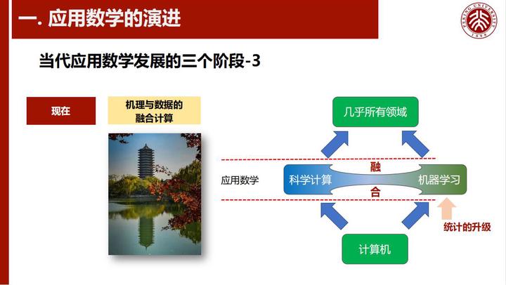 从应用数学的价值观与发展历史说起,阐述什么是机理与数据的融合计算及其特点和意义,然后通过智慧气象预报与AI for Social Science两个方面来介绍如何有效地结合具体场景来应用机理与数据的融合计算,最后分析了融合计算对应用数学的影响,并探讨如何加强相关体制机制的建设来促进机理与数据融合计算的发展。