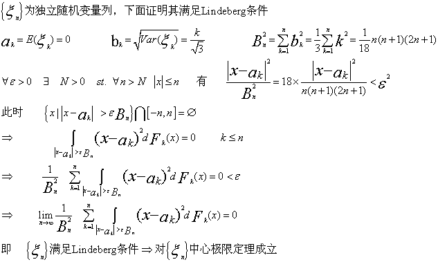 8. 设{ξn}为独立随机变量序列, 且ξn服从( -n, n)上的均匀分布, 证明对{ξn}中心极限定理成立.