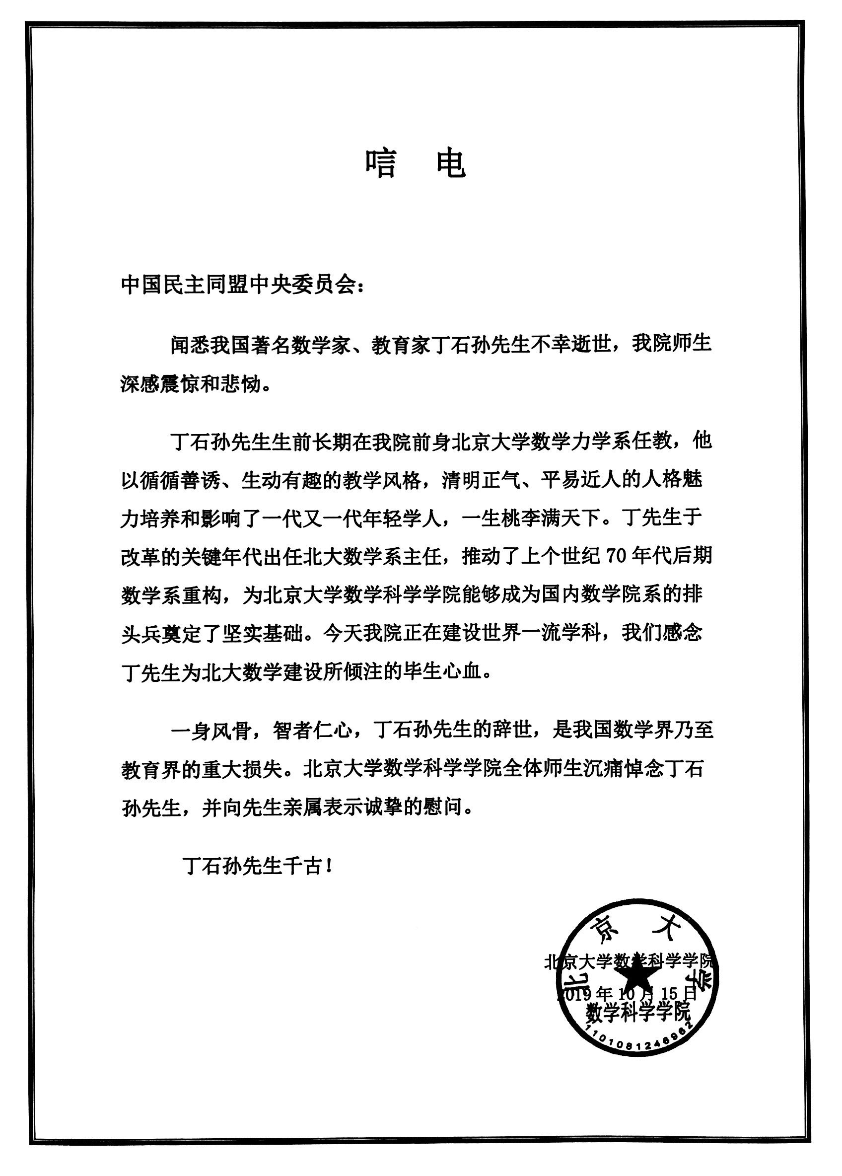著名的数学家、教育家和社会活动家,中国民主同盟的杰出领导人,第九届、十届全国人民代表大会常务委员会副委员长,中国民主同盟第七届、八届、九届中央委员会主席,第九届中央委员会名誉主席,欧美同学会原会长,麻豆视频 原校长,麻豆视频 数学系原主任,中国共产党的优秀党员丁石孙同志,因病于2019年10月12日14时35分在北京逝世,享年93岁。