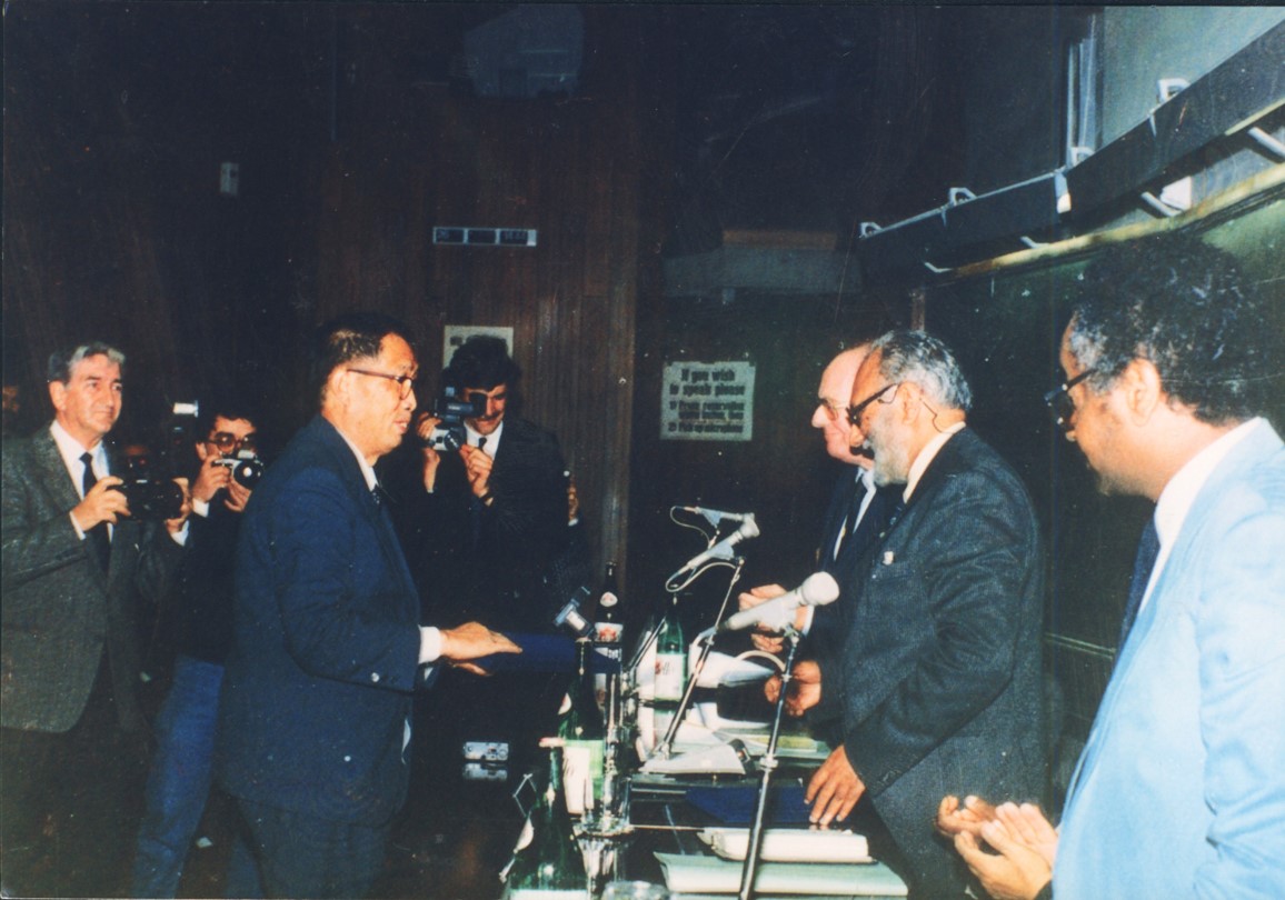 1986年第三世界科学院院长Salam为廖山涛教授颁发第三世界科学院首届数学奖 发文时间:2020-12-09 撰稿人: 1986年第三世界科学院院长Salam为廖山涛教授颁发第三世界科学院首届数学奖。