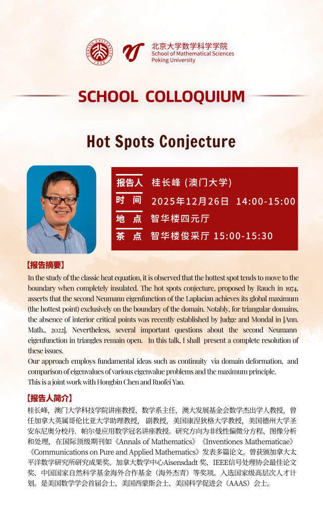 报告摘要:In the study of the classic heat equation, it is observed that the hottest spot tends to move to the boundary when completely insulated. The hot spots conjecture, proposed by Rauch in 1974, asserts that the second Neumann eigenfunction of the Laplacian achieves its global maximum (the hottest point) exclusively on the boundary of the domain. Notably, for triangular domains, the absence of interior critical points was recently established by Judge and Mondal in [Ann. Math., 2022]. Nevertheless, several important questions about the second Neumann eigenfunction in triangles remain open. In this talk, I shall present a complete resolution of these issues.