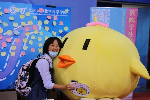 6:44,第一位新生来到报到站,迎新工作正式开始。新同学在工作人员的引导下核对信息、完成注册、领取材料。然后在贴纸上写下了想和数院说的第一句话并贴在了留言展板上,并在展板前照相留念,学生志愿者为他们留下了初入学院的专属记忆,学院吉祥物“识数鸡”也来到迎新现场欢迎新同学。