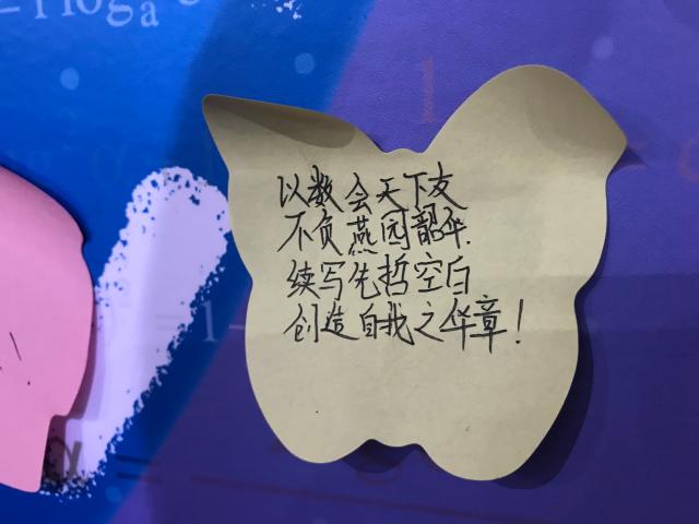 新生留言板上,留下了每一位新生对数院生活的期待,有激动、有坦率、有梦想、有期许。其中有一张空白的贴纸,留下这张空白贴纸的是来自南京外国语学校的陆苏扬同学。他说燕园对他来说,意味着无限可能,希望未来自己能描绘出全新的蓝图。