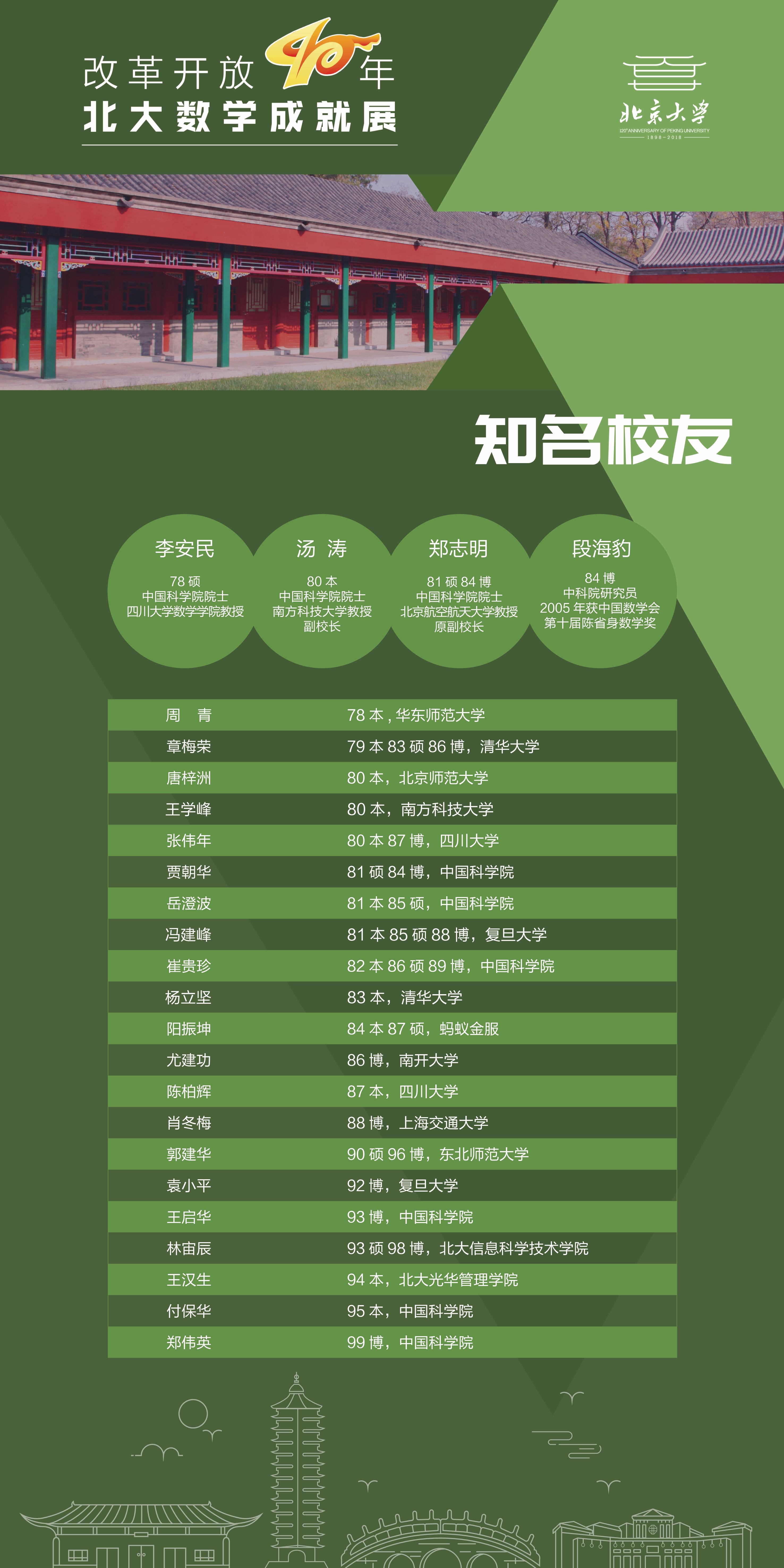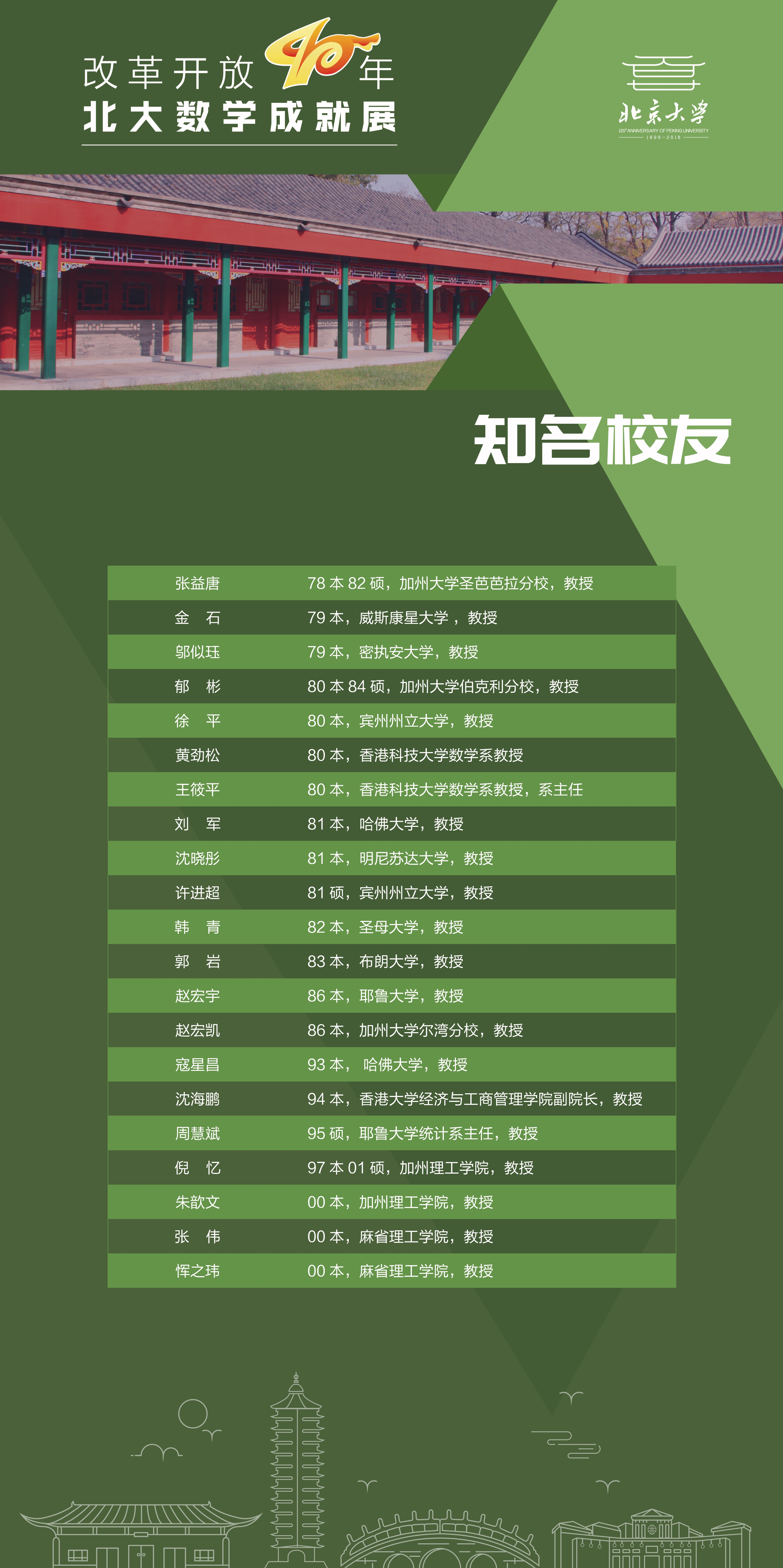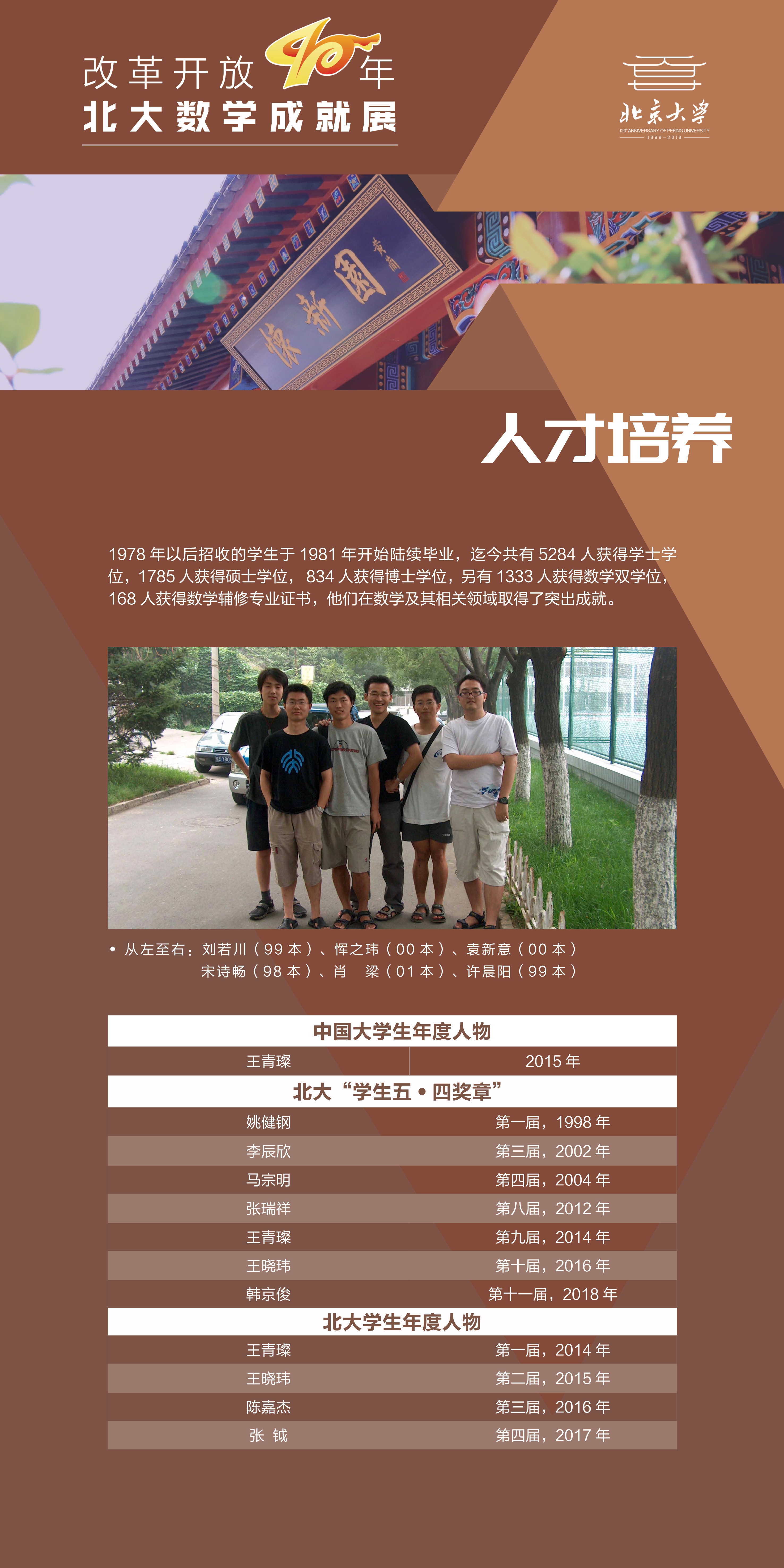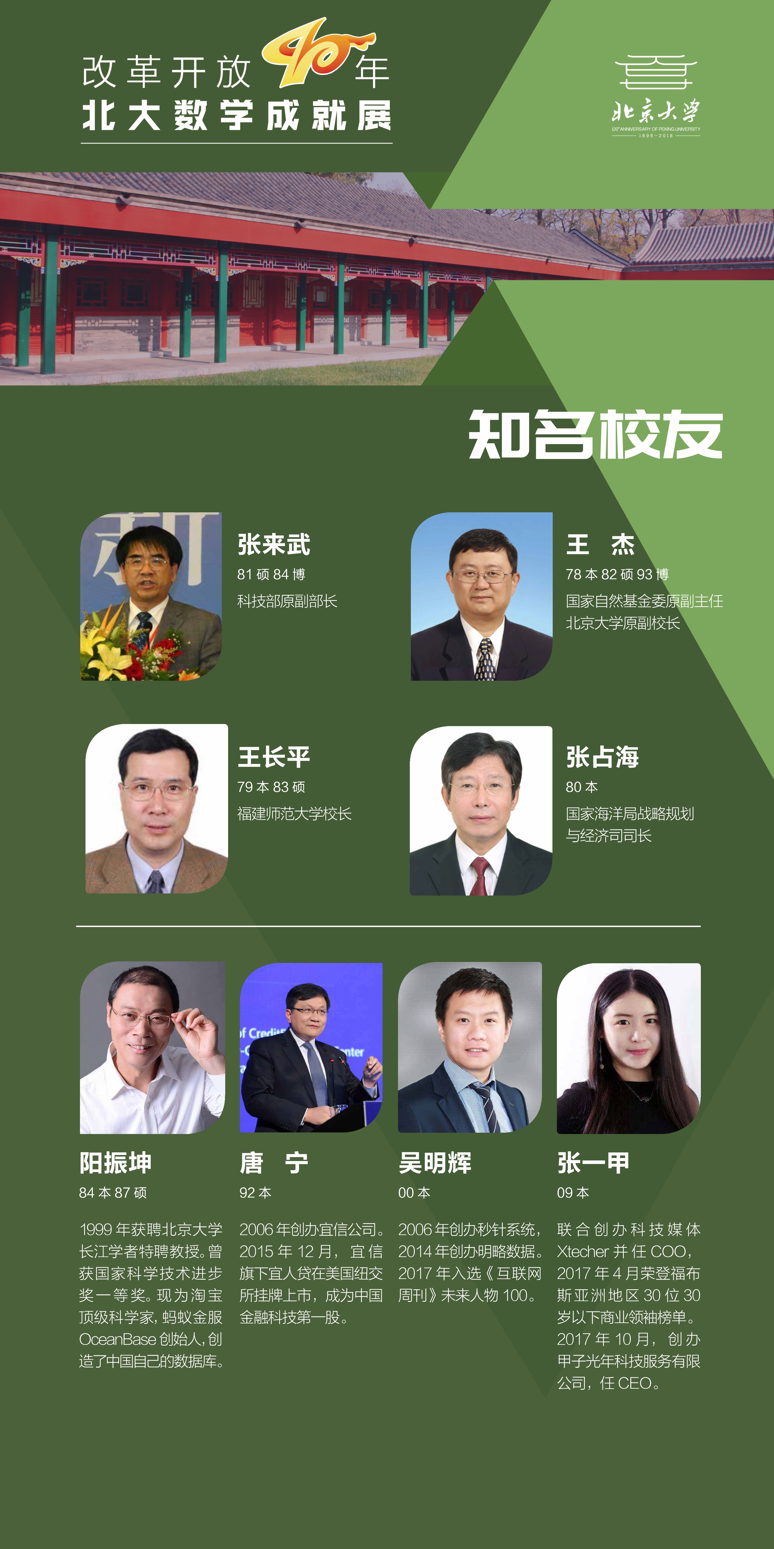 数学学科几代同仁开拓进取,砥砺奋进。站在改革开放四十年的历史节点,我们组织这个展览,回顾学院发展历程,庆祝北大百廿校庆!致敬胼手胝足的奋斗者!奏响建设世界一流学科的进行曲!