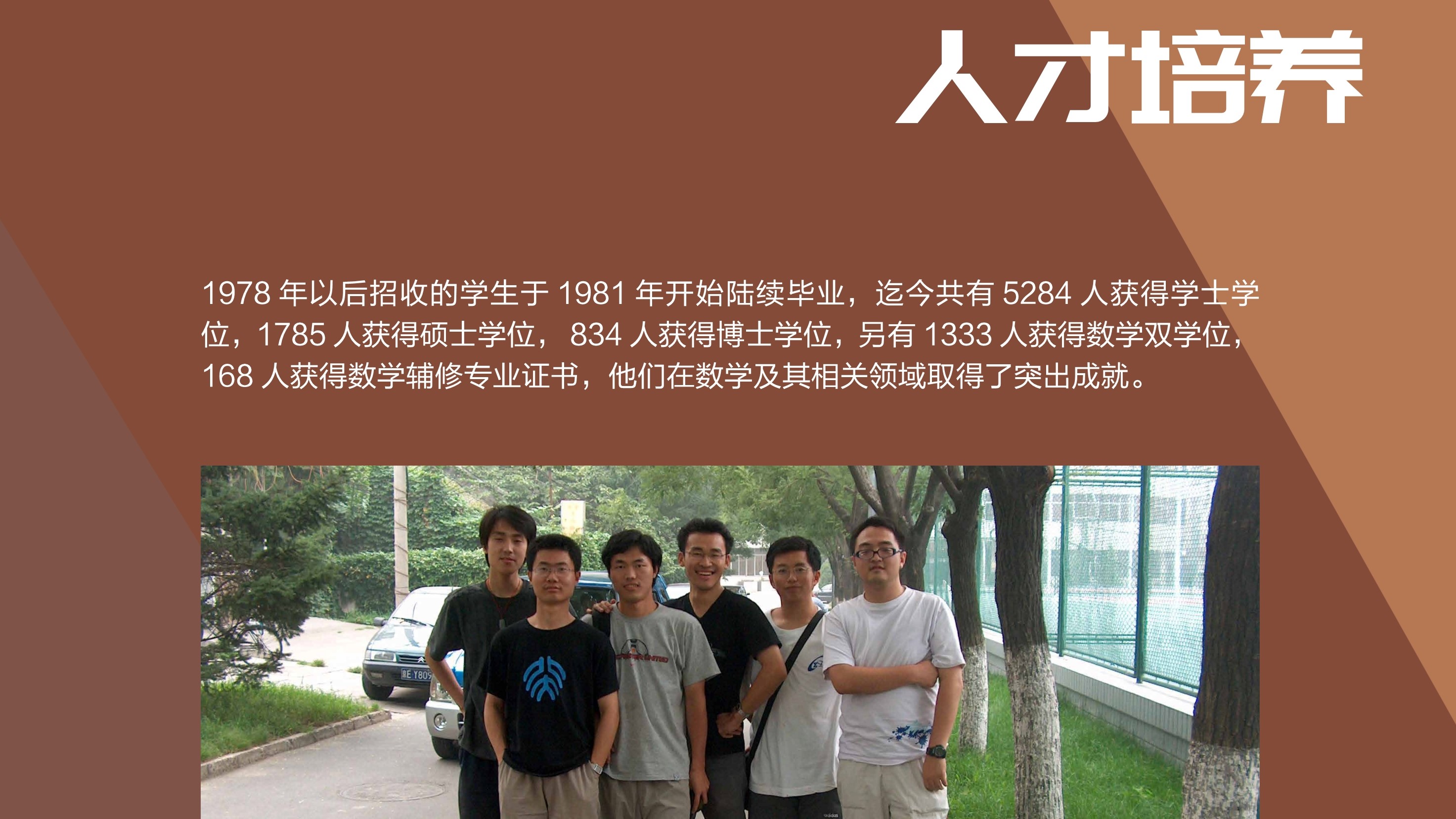 数学力学系,力量倍增,人才辈出:一时英杰云集燕园,向科学进军,各项事业渐次展开,云蒸霞蔚。然而十年浩劫打断了这一发展进程,教师进工厂下农场,学生四散飘零,教学科研近乎中断。第三阶段从文革结束到今天,几代畴人接续奋斗,汲取 65 年时断时续的办学经验教训,肩负赶超世界先进水平的使命,得到全国人民大力支持,在学科建设 人才培养科学研究,社会服务等方面取得突出成就,陈列于此,向关心北大数学的校友们朋友们汇报。