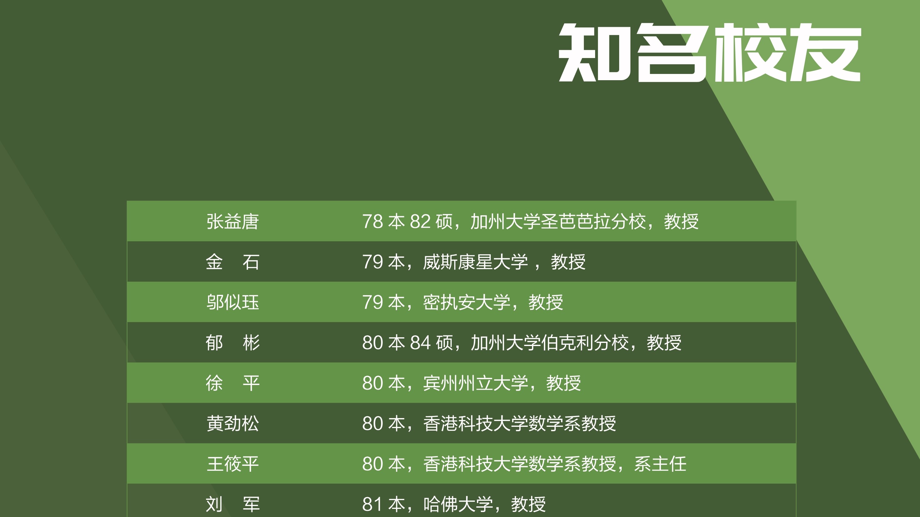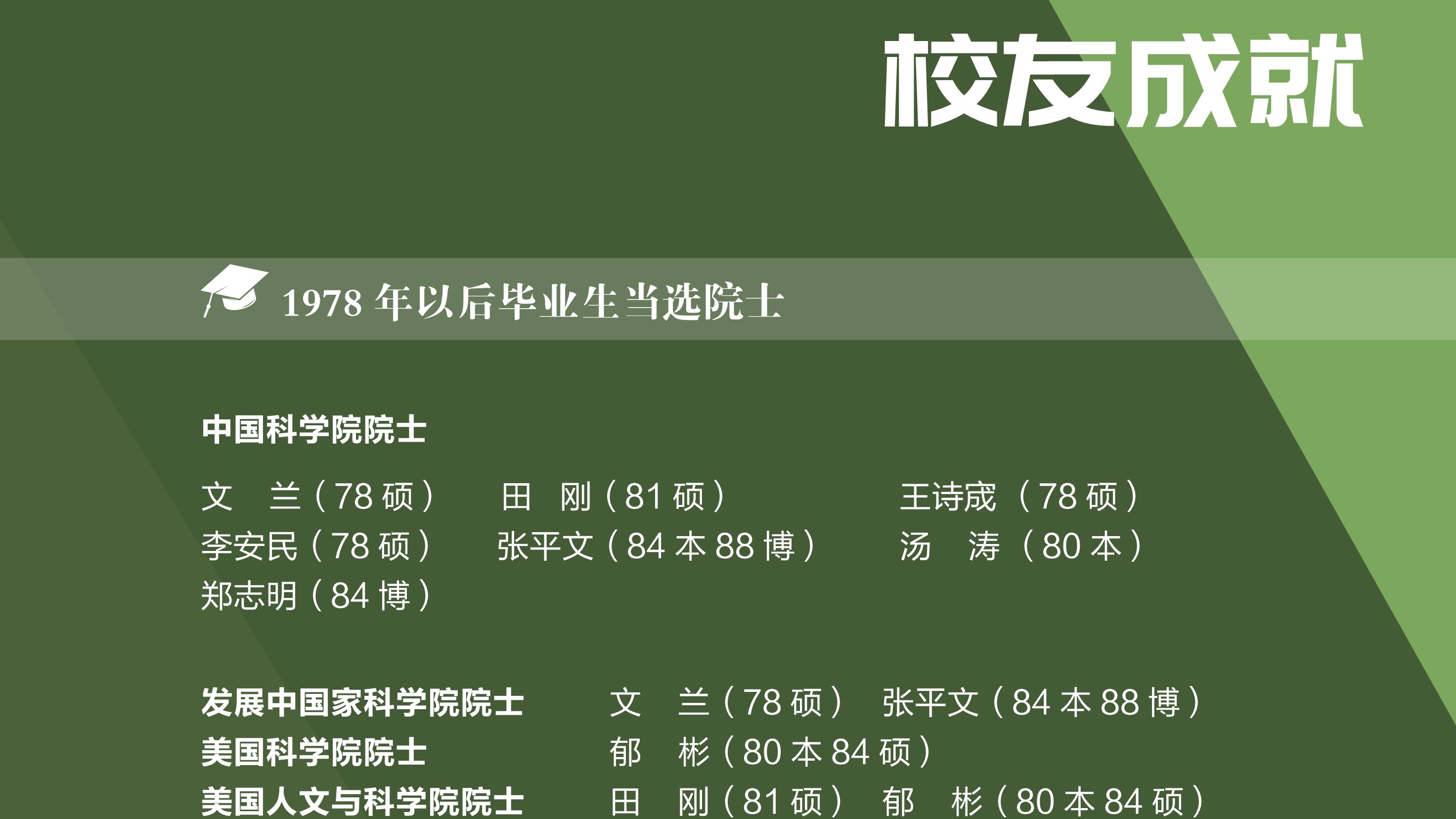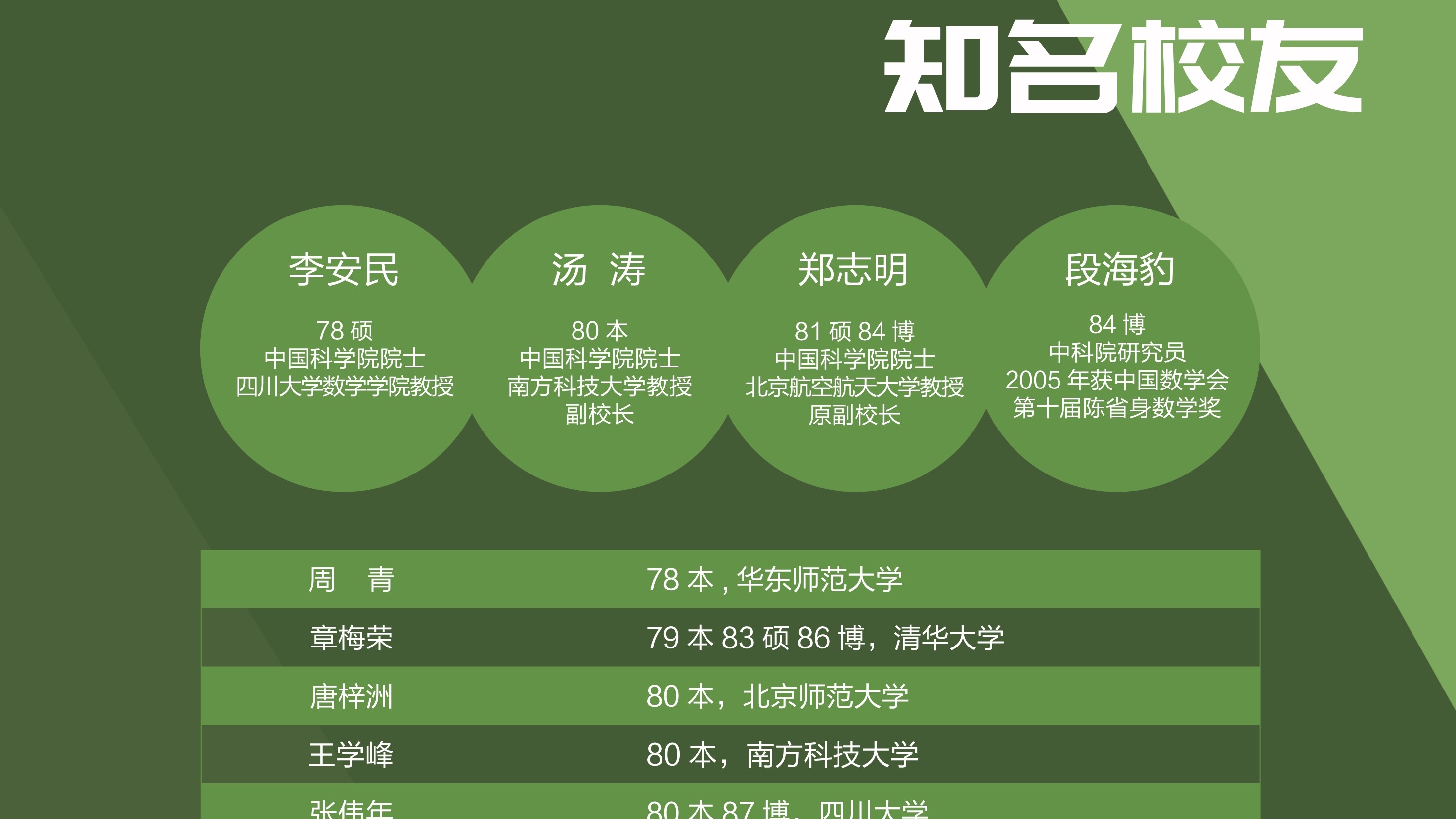 四十年来学院共培养了七千九百多位学生,他们活跃在全国各条战线,乃至世界各地更加广阔的舞台上,在数学及其相关领域取得突出成就。校友们的成就体现了教师的劳动价值,我们为曾经陪伴他们成长而感到骄傲。由于院友数量巨大,展览很可能挂一漏万,疏忽之处尚祈谅解,并请指正.