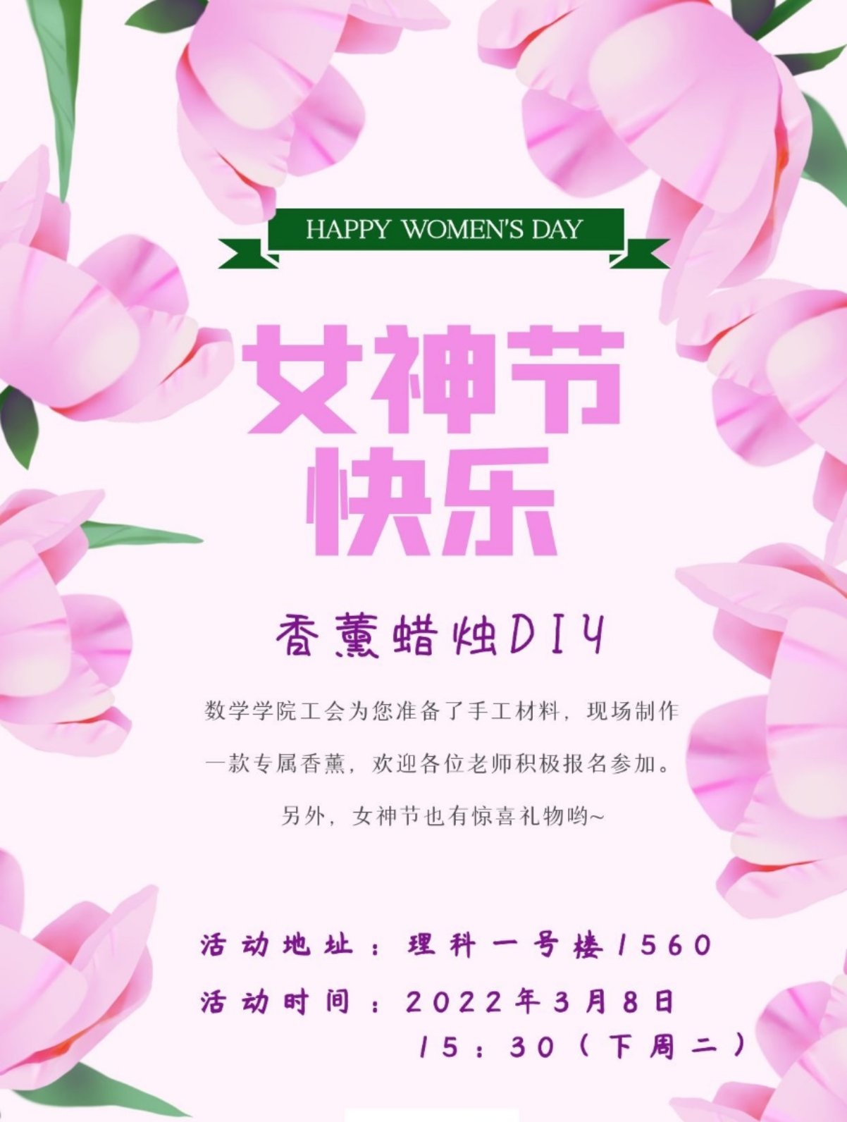 美丽女神节,情暖三月天。在这个春暖花开的美好时节,祝福数院工会全体女神节日快乐、幸福美满,愿你善待自己,成为自己的太阳,温柔从容,怀揣希望,一如既往地绽放熠熠芳华,探索生活和工作的更多可能!