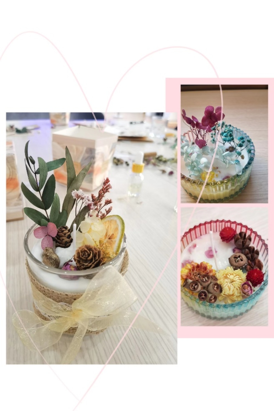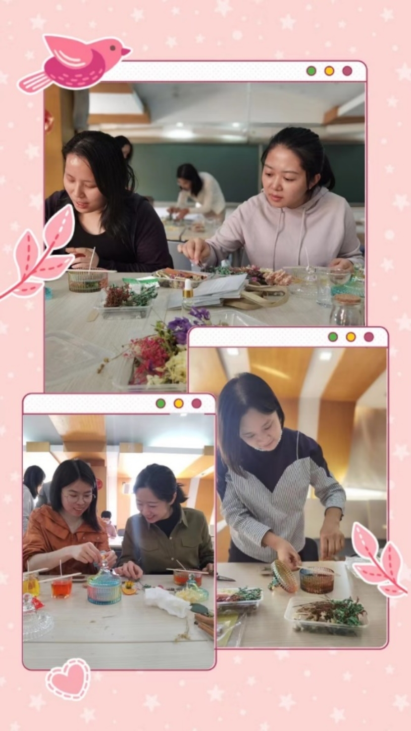活动伊始,女工委员牛贺老师向大家详细讲解了注意事项,所需材料、使用步骤和制作流程。随后女神们根据自己的喜爱选取了原料、五彩干花、精油等一系列制作材料。女神们在女工委员牛贺老师的讲解下,用自己灵巧的双手,发挥想象力和创造力,将天然植物精油加入融化后的蜡液,依次放入每个模具,制作灯芯,装瓶,在蜡液进入半凝固状态时,便可以开始根据自己的爱好,发挥独特创意,将干花放入蜡液中加以点缀,耐心等待蜡液凝固……不一会儿,一瓶瓶散发着薰衣草、柠檬等气味的香薰蜡烛就做好了。现场,音乐轻柔、空气芬芳,让人身心放松,大家沉浸在一场随香漫舞的心灵芳疗中,体验从自然到美好的过程。制作活动让大家体会到生活中不仅有花、有爱,还有迷人的香气慰藉,DIY的制作唤起了女神们内心对生活更深层次的热爱,增添了生活的仪式感。