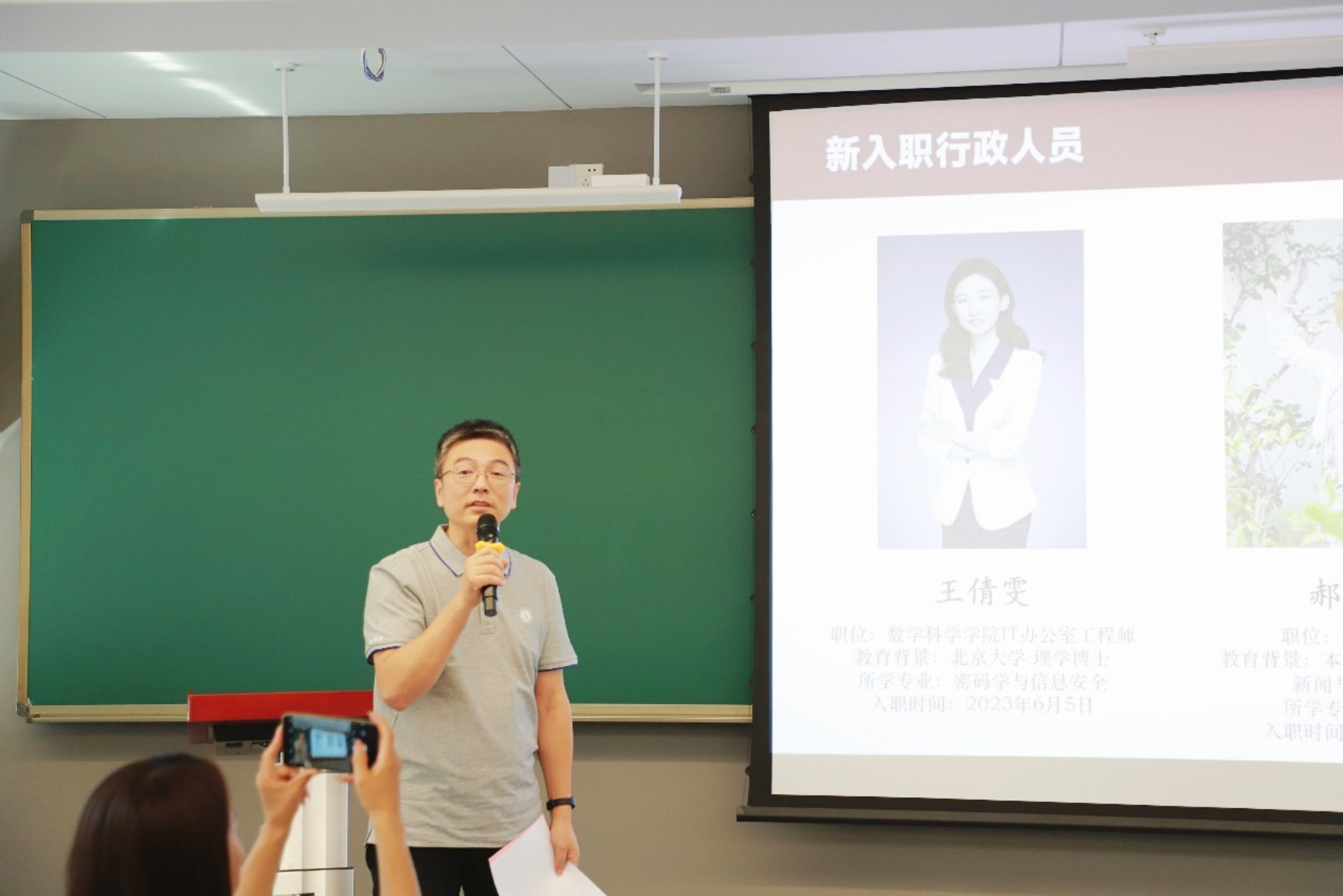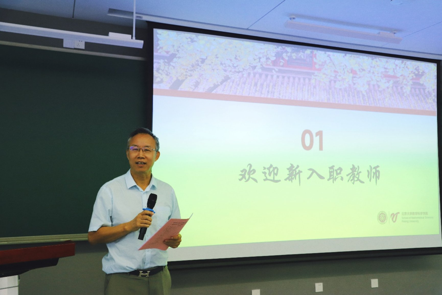 院长陈大岳简要地介绍了新入职的教师及博士后,党委副书记兼副院长孙赵君简要地介绍了新入职的行政人员,工会主席周铁介绍了荣休教师莫小欢教授、田玉国会计,从教三十年教师刘培东教授。