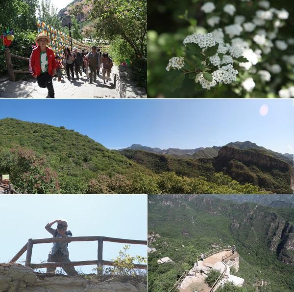 天空蔚蓝,偶有几朵白云掠过,遮掩了头顶的阳光,伴着不时而至的山风,为攀登者带来了几分清凉。不知名的小白花团簇成一个个花球点缀于树间,让登山时燥热的心情也变得平和而安详。山路尽头是鹰嘴岩,三个天然形成的三角状岩石平台高低错落地探出山体。踏上平台尽头,坡峰岭壮美的山谷一览无余,令人心旷神怡。已是80岁高龄的张绪定老师也健步如飞地跟随先遣队率先登顶,将顶峰的壮观景色借手中的相机尽入囊中。