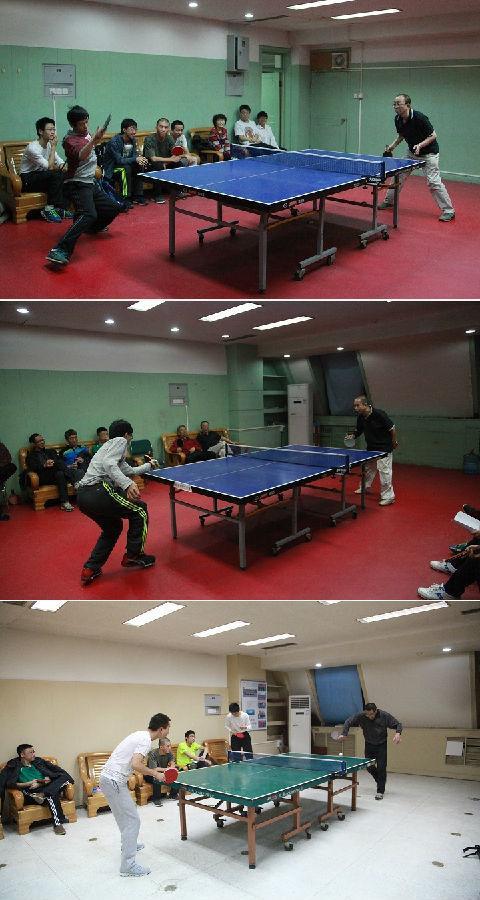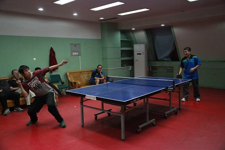 几场焦点之战都在工会之家东侧的“红室”上演。学生中的种子选手与老师的激烈对抗吸引了所有观众的眼球。球台两侧的沙发上坐满了热情的观众。学生队球员体能占优,战术合理,起拍果断凶狠,时常打出让观众们大声叫好的大力冲拉球。老师们也不甘示弱,主动求变,努力控制比赛的节奏。虽然学生队在这几场比赛中占据了上风,但老师们几乎每场都把比赛拖到了决胜局。今后双方的对抗,鹿死谁手尚未可知。