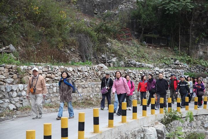 几场雨水过后的北京,凉风习习,秋意盎然。在蜿蜒的十渡山谷蛇行一番后,大巴停靠在景区门前。诸多老师久未谋面,彼此嘘寒问暖,谈笑风生。经浮桥穿过山前宽阔的河面,便是孤山寨的寨门。老师们按捺不住心中的激动,在寨门前合影留念。大家舍弃了电瓶车,步行前往谷中景点。一路上遍是挂满大柿子的丰收树,令人也不禁感受这秋日的喜悦。