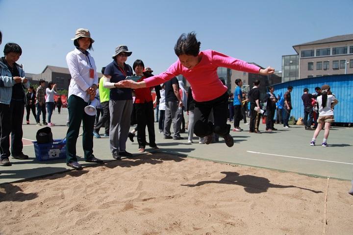 李萍老师在团体项目袋鼠跳接力比赛中(图/钮凯福)