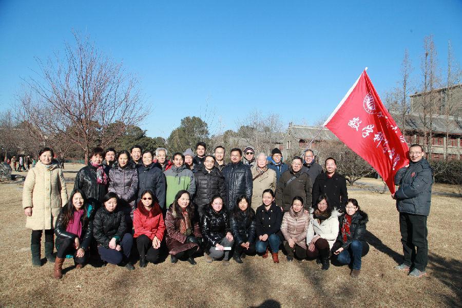 天空一扫昔日雾霾,蔚蓝无边。冰凉微风拂过面庞,提神醒脑。冬日慵懒的未名湖畔,张平文书记、陈大岳副院长、夏壁灿副院长、王冠香工会主席和刘雨龙副书记身先士卒,引领数学学院的大队矫健前行。数学学院的队中既有年逾古稀的郭懋正、张顺燕老师,也有活力四射的青年教员。未名湖北岸、红一楼、办公楼华表、南北阁……一路上老师们步履轻盈,谈笑风生,不多久就抵达了终点站――第二体育馆北侧。意犹未尽的老师们集结在静园草坪集体合影留念。