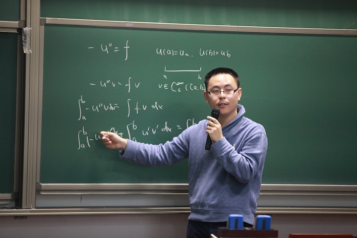 吴老师在讲演中从海洋钻井支架设计入题,通过工业史上的多个样例生动地阐述了有限元方法的准确性在工业设计与生产中的重要理论意义和应用价值。然后他从一维分片连续有限元空间入手,阐述有限元空间的三要素:单元、形函数空间、自由度。随后他将结果推广到二维情况,并介绍了如何用有限元方法求解Poisson问题,用整洁的板书与清晰的讲解将大家初步引入有限元方法的大门。