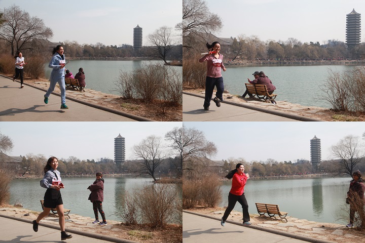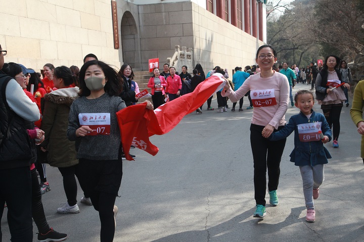 本次赛事每队由七位老师组成,以接力形式环绕未名湖十圈,其中前三位老师各完成2圈。春意盎然的燕园,阳光明媚,气候温和,微风习习。老师们兴致高昂,跃跃欲试。随着开令枪的一声脆响,身披01-01号的学院工会副主席郑春鹏老师和02-01号的崔文慧老师随第一集团率先冲出重围。两位老师矫健的身姿闪耀在未名湖畔,为数院两队创建了良好的开端。随后,十二位巾帼女将陆续接棒出发,流光掠影于春日燕园,展现了数院的运动风采。最后一棒,两队两位老师携手持数院院旗健步冲线,为数院工会的本次参赛画上了圆满的句点。