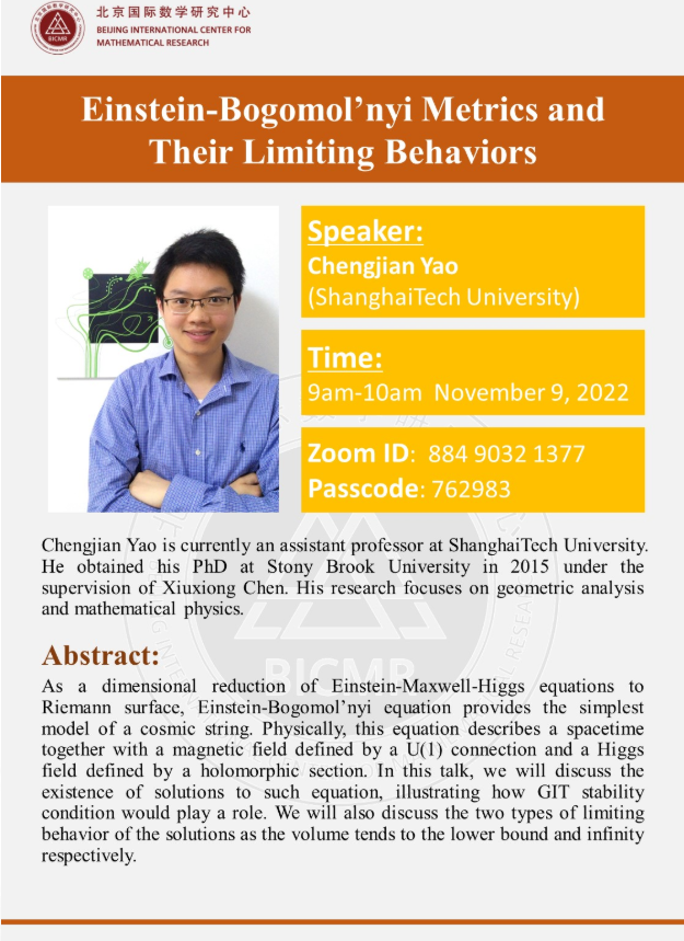 Chengjian Yao is currently an assistant professor at ShanghaiTech University. He obtained his PhD at Stony Brook University in 2015 under the supervision of Xiuxiong Chen. His research focuses on geometric analysis and mathematical physics.