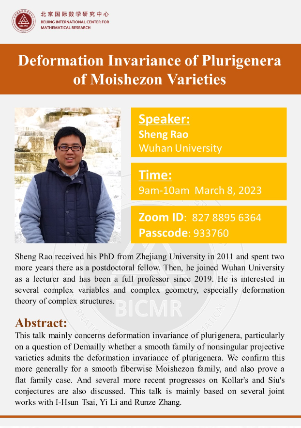 Speaker: Sheng Rao received his PhD from Zhejiang University in 2011 and spent two more years there as a postdoctoral fellow. Then, he joined Wuhan University as a lecturer and has been a full professor since 2019. He is interested in several complex variables and complex geometry, especially deformation theory of complex structures.