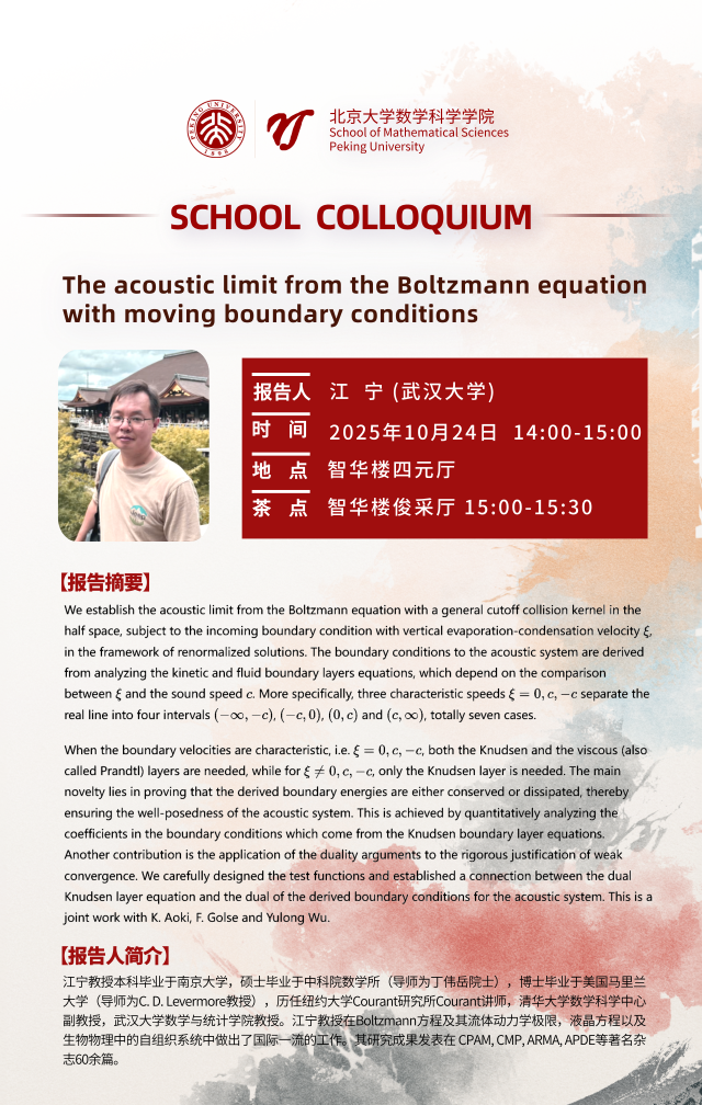 江宁教授本科毕业于南京大学,硕士毕业于中科院数学所(导师为丁伟岳院士),博士毕业于美国马里兰大学(导师为C. D. Levermore教授),历任纽约大学Courant研究所Courant讲师,清华大学数学科学中心副教授,武汉大学数学与统计学院教授。江宁教授在Boltzmann方程及其流体动力学极限,液晶方程以及生物物理中的自组织系统中做出了国际一流的工作。其研究成果发表在 CPAM, CMP, ARMA, APDE等著名杂志60余篇。