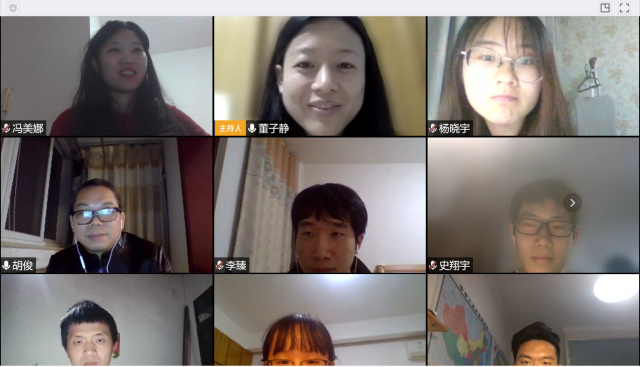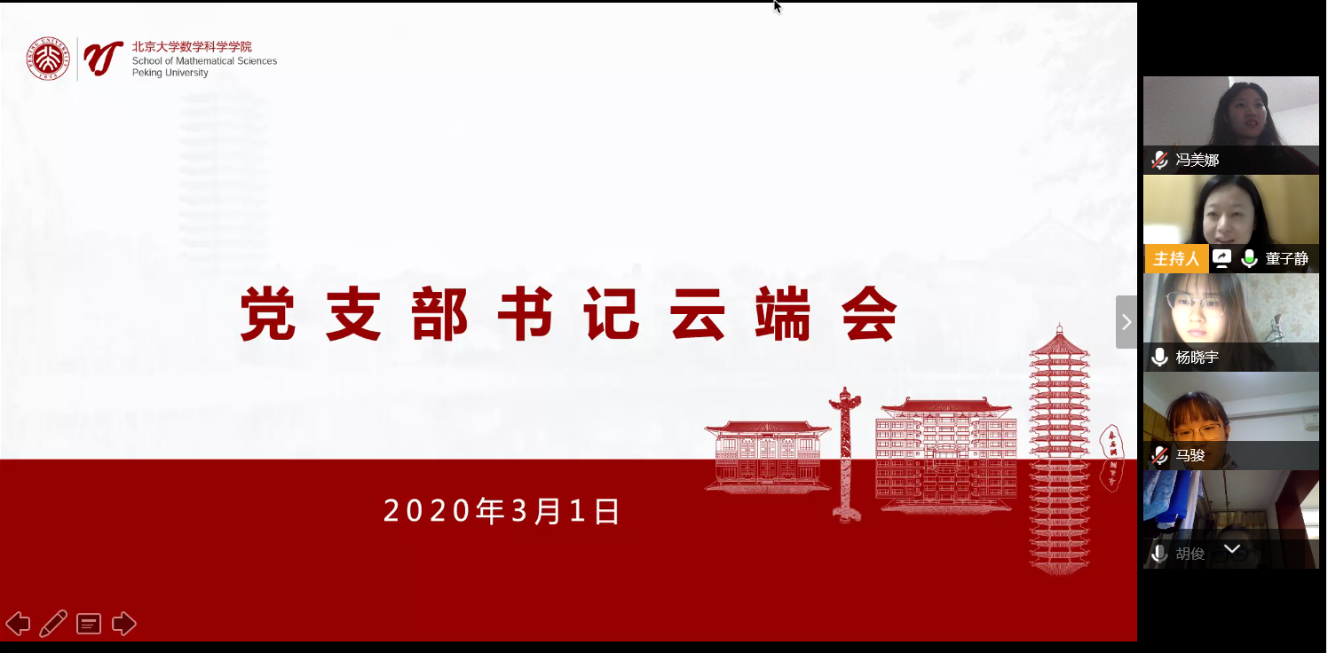 胡俊老师总结发言。胡老师肯定了各位党支部书记的分享发言,感谢学生党支部书记们的辛勤工作,通过视频会议感受到大家良好的精神面貌。新冠肺炎疫情爆发后,学校党委发布了《关于发挥全校党组织战斗堡垒作用和共产党员先锋模范作用,坚决打赢疫情防控阻击战的通知》,学院党委致信党支部委员,鼓励大家冲锋在前,共克时艰。当前,同学们学习总书记的回信精神,有很多工作待我们去开展,很多巧思待我们去挖掘,比如《应用数学导论》课程对于疫情数据的研究等。希望同学们都能领会落实,继续带领各支部,不忘初心、牢记使命,在特殊时期充分发挥党支部的战斗堡垒作用,为战胜疫情做更大贡献!