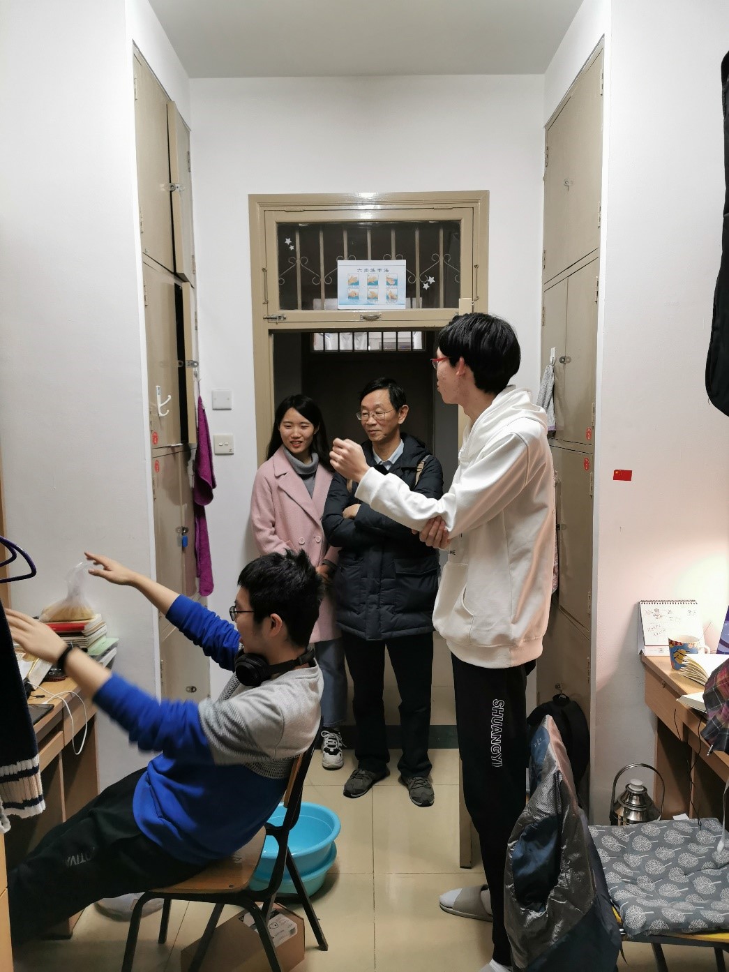院长陈大岳、党委书记胡俊、党委副书记董子静、团委书记冯美娜、辅导员张力今、崔孟龙走访本科生宿舍,尤其对37楼和45甲楼逐一细致查问。院领导逐一敲开每个宿舍的门,指导学生打开阳台窗户与门口换气窗。陈大岳和胡俊老师询问同学们的身体健康状况和期末考试安排,提醒同学们养成良好的生活习惯,饭前便后洗手、每日开窗通风、及时清理垃圾、保持宿舍整洁。学工办几位老师向同学们介绍了诺如病毒的特点和防治要点,提醒同学们情绪上不要恐慌,行动上高度重视,做好防范工作,注意个人卫生。如果发现头晕、恶心、呕吐等情况,第一时间联系专业人员清理呕吐物,及时报告辅导员并前往校医院就诊。考试安排方面的困难可以联系辅导员、学院老师,学院会尽最大努力帮助同学们协调解决。
