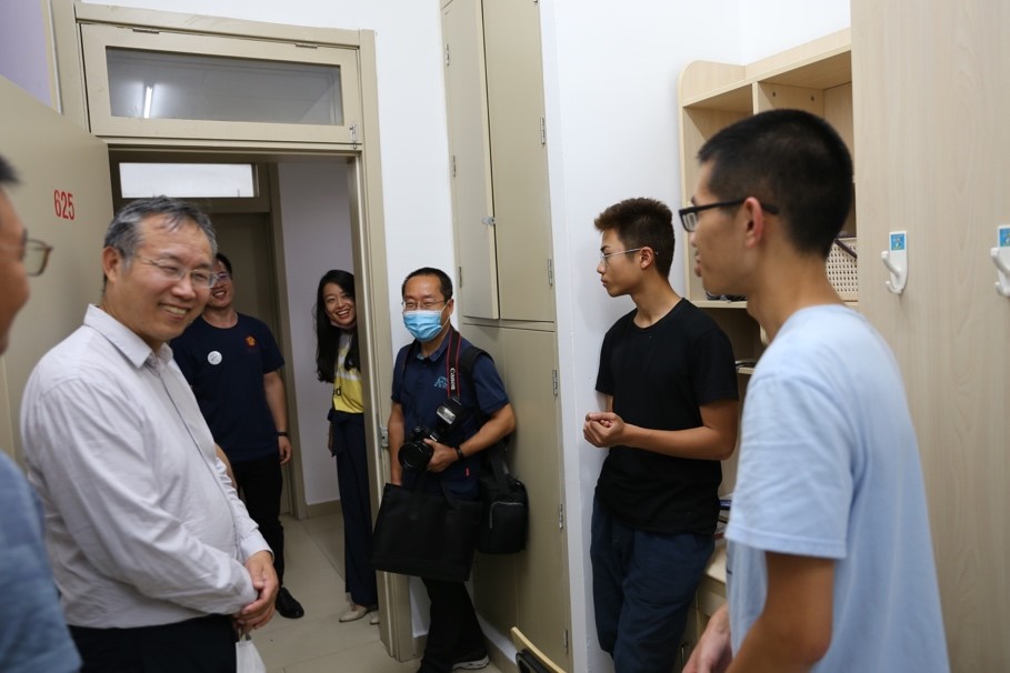走访同学宿舍前,陈大岳与楼长、驻楼辅导员交流新生入住情况,嘱咐班主任、辅导员交流事项,然后一一叩响新生的宿舍门。