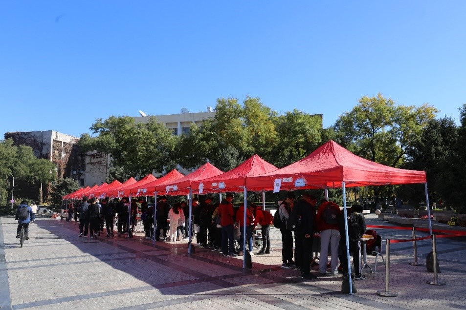 早上9点,百周年纪念讲堂广场处便立起了一排红色的棚子,数院同学们搭建好活动场地,设置好游戏关卡,迎接前来挑战数学难题的师生们。