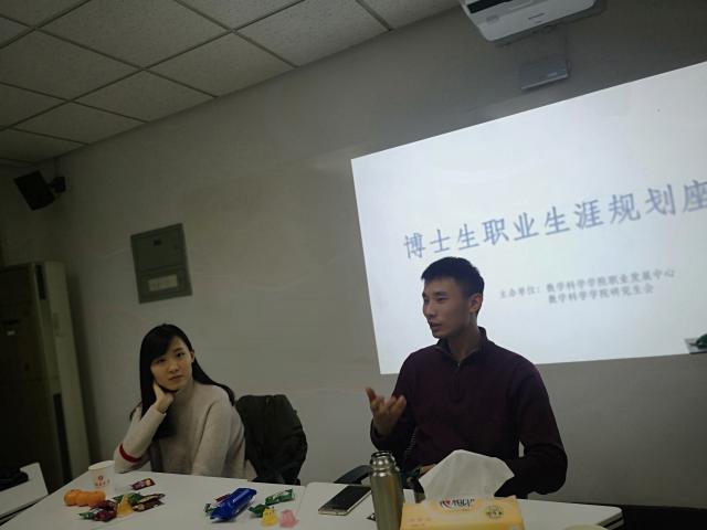 首场博士生职业生涯规划座谈会在理科一号楼1304室举办。2015届基础数学系博士生院友赵彤远、2018届概率统计系博士生院友孟琪应邀作为嘉宾,与到场同学分享了博士阶段的求学经验,并为同学们解答关于职业生涯规划的种种疑难。院党委副书记董子静,院学工办副主任牛贺出席活动。