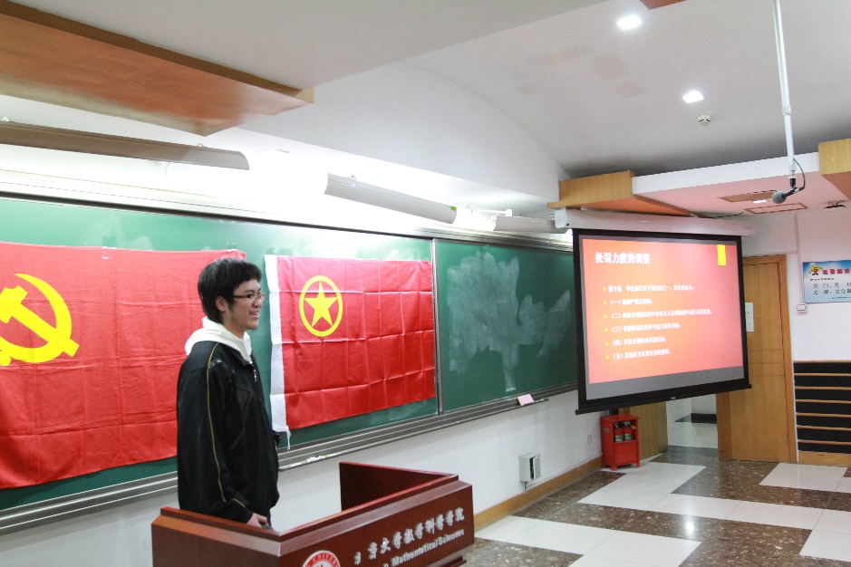 学生违纪处分办法》等校规校纪进行重点学习,并面向班团同学开展宣讲,全面了解与重点学习相结合的模式,为后续党员领学奠定了良好基础。宣讲中把握“关键点”、“薄弱点”“易疏漏点”进行重点解读,结合学习生活中具体案例和情景,通过互动问答、竞赛抢答等形式加强同学们的参与度和对校规校纪的深层理解。4月初,学院召开了专项教育活动总结交流会,学生党支书们就学习和宣讲过程中的经验、反思及创新之处进行交流。学院党委书记胡俊老师在总结交流会上指出,扎实落实党的各项章程是高效开展党内工作的基石,各支部需要在本次专项教育活动的基础上继续加强学习、深入落实,始终发挥好党员同学的示范引领作用。
