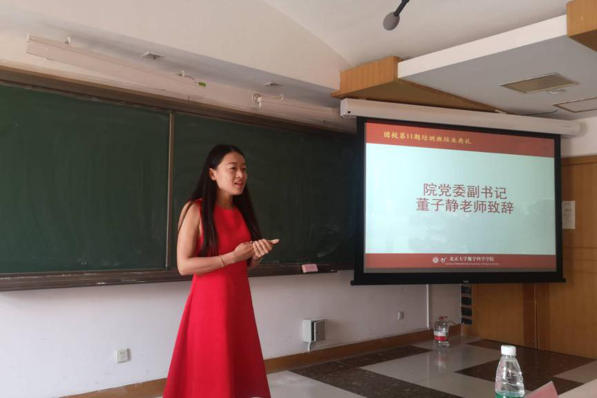 随后,院党委副书记董子静老师致辞。董老师总结到,数院团校一直遵循着在快乐之中学习知识、提高能力的宗旨,让每位学员除了收获技能与知识之外,还可以收获难忘的友情与美好的记忆。董老师热情地祝贺同学们顺利在团校毕业,并用亲切朴实的话语祝贺同学们学有所获、学有所成。