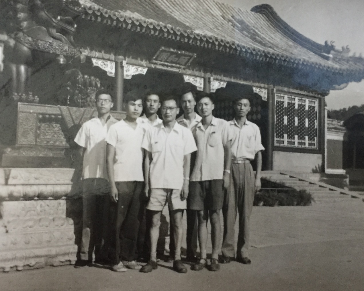 1964年,吴光磊先生和几何专门化的师生于颐和园门前合影(前排左起:张宜金,吴光磊,田畴;后排左起:陈维桓,马希华,章学诚,董玺印)