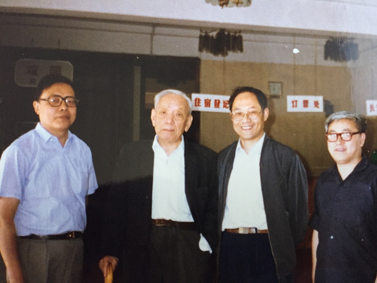 1995年,陈维桓与陈省身在南开数学研究所招待所合影(左起:陈维桓,陈省身,吴报强,李安民)
