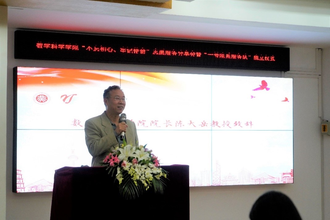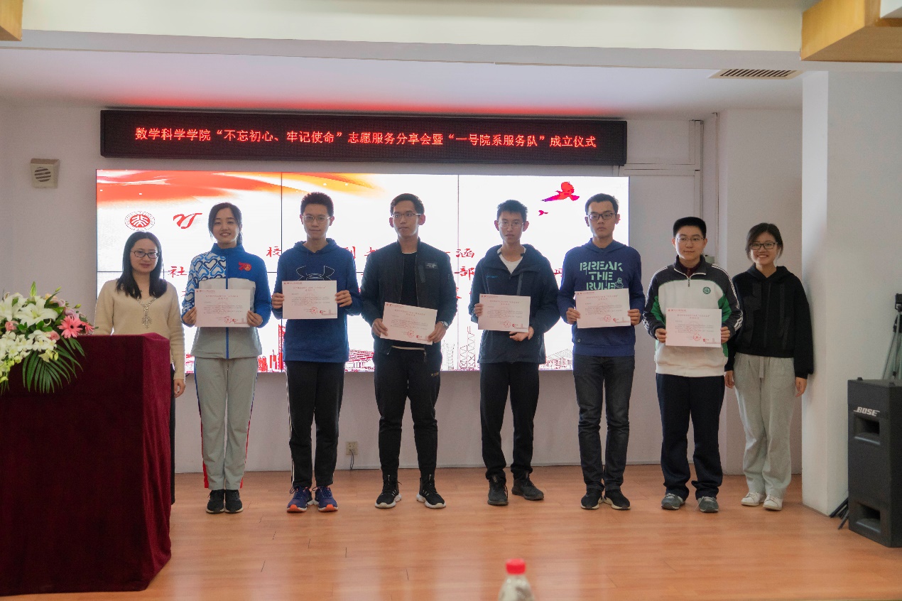 “不忘初心、牢记使命”主题志愿服务分享会暨“一号院系服务队”成立仪式在理科一号楼1560室举行。数学学院院长陈大岳教授、教务长办公室主任王小玥、学生工作部副部长王欣涛、校团委副书记王一涵、校团委社会实践部部长李晓丹,以及学院团委书记冯美娜,团委副书记张力今、崔孟龙参加。分享会由学院党委副书记董子静主持。