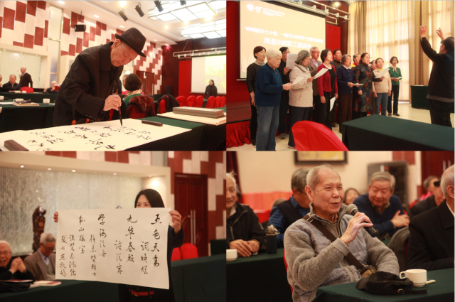 今年恰逢新中国成立70周年,“峥嵘韶光七十载,一路丹心抚芳华”交流会的主题是:唱响70年、讲述70年、寄语新时代。交流会在一帧帧老照片中拉开序幕。陈维桓、姚孟臣等退休老师带来歌曲《中国中国,鲜红的太阳永不落》、《天边》,深情的演唱、雄浑的歌声将大家的思绪带到祖国广阔的天地间。“我和我的祖国,一刻也不能分割......”、“歌唱我们亲爱的祖国......”,以邵士敏、庄大蔚、钱敏平等14位退休老师为代表的最美合唱团成员通过激昂高亢的歌声献礼祖国70年华诞,引得现场掌声迭起。张顺燕老师舞动丹青、以书言志,翰墨抒真情,寄语百年学府和伟大祖国。