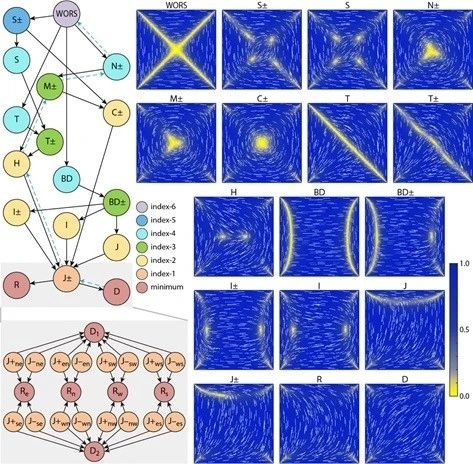 该项工作提出了一个构建“路径图”的计算方法。路径图描述了不同的极小被相应的一阶鞍点连接,低阶鞍点被相应的高阶鞍点连接,最终连接到一个最高阶鞍点的层次结构图。算法根据路径图的特征,从一个最高阶鞍点出发,利用高阶鞍点动力学方法沿其各个不稳定方向进行向下搜索,找到与其相连的低阶鞍点,再将算法应用到新找到的鞍点上,继续计算直到找到所有可能的极小。同时,算法结合向上搜索寻找最高阶鞍点,从而可以高效地在能量景观上构建出完整的路径图。该算法成功应用于受限在方形区域中的向列相液晶材料,利用Landau–de Gennes模型构建了向列型液晶缺陷解的完整路径图。