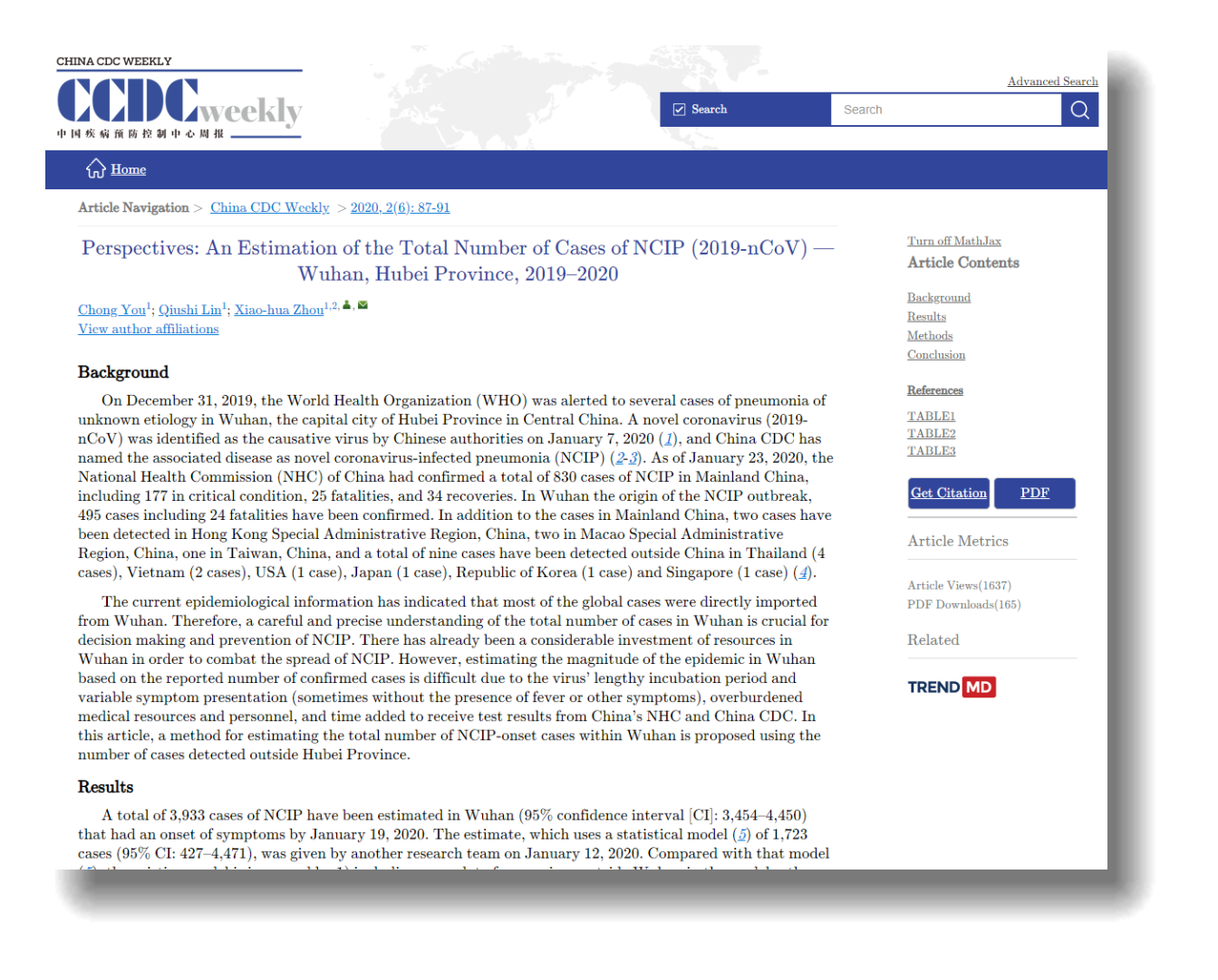 团队于1月23日完成了武汉市在封城前新型冠状病毒潜在感染人数的估计(An Estimation of the Total Number of Cases of NCIP (2019-nCoV)),这项成果于1月29日被中国疾病预防控制中心官方杂志《中国疾病预防控制中心周报(英文版)》(China CDC Weekly)接受发表。文章作者是Chong You(尤翀)、Qiushi Lin(林秋实),通讯作者是Xiao-hua Zhou(周晓华)。