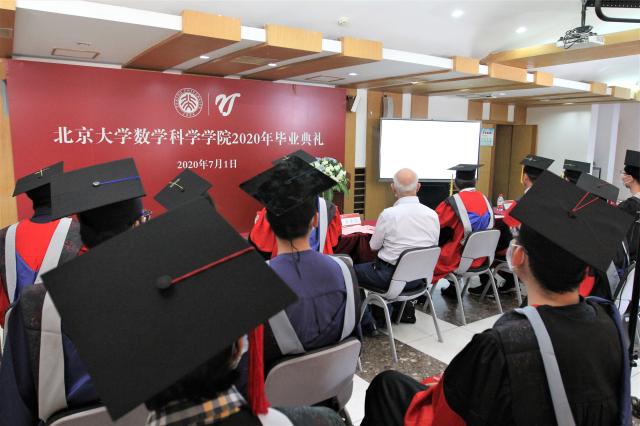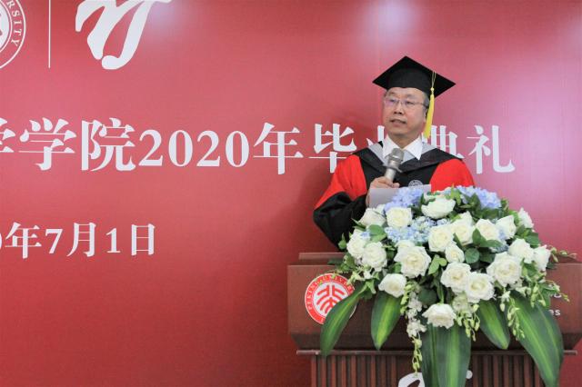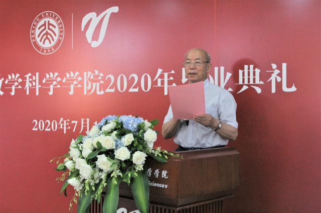 院长陈大岳教授致辞,为同学们送上寄语和祝福。陈院长对同学们置身新冠疫情之中做出的贡献加以肯定,同时希望同学们将扎实的数学基础、严谨的推理思维和科学精神运用到工作与生活中,并以院友王选、张益唐等为榜样,“计利当计天下利,求名应求万世名”,树立远大奋斗目标,书写完美人生长卷,建设更加强盛的祖国。最后,他以北大数学校友会理事长的名义,诚邀2020届数院毕业生作为校友常回母校看看。