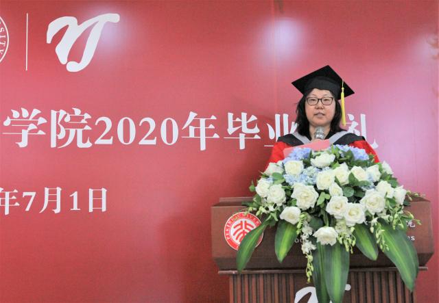 教师代表、金融数学系主任吴岚教授致辞。她讲到,今年正好是她入学北大四十年,她与毕业生们分享了五个观点,包含她在北大的故事,对数学的好奇心、成长的快乐以及抱负与责任。希望同学们为自己、家庭、他人和国家承担更多的责任,兼济天下或独善其身,永葆好奇心。