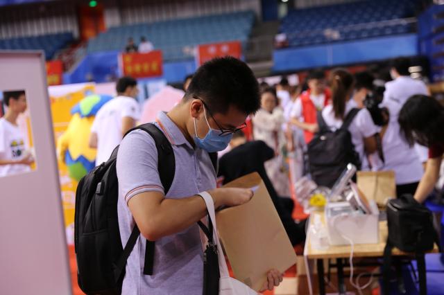 6:44,第一位新生来到报到站,迎新工作正式开始。新同学在工作人员的引导下核对信息、完成注册、领取材料。然后在贴纸上写下了想和数院说的第一句话并贴在了留言展板上,并在展板前照相留念,学生志愿者为他们留下了初入学院的专属记忆,学院吉祥物“识数鸡”也来到迎新现场欢迎新同学。