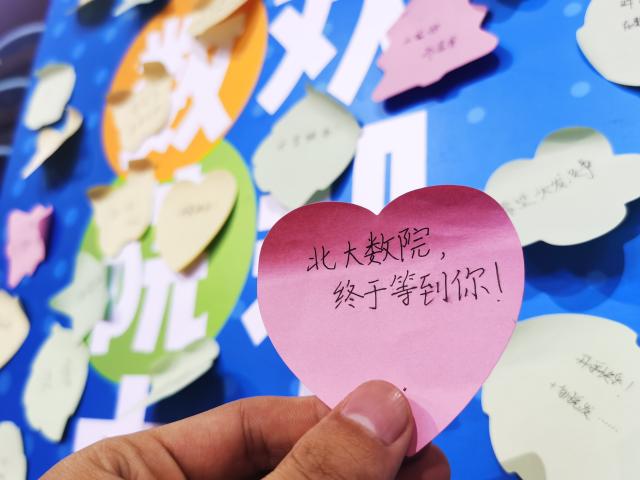 新生留言板上,留下了每一位新生对数院生活的期待,有激动、有坦率、有梦想、有期许。其中有一张空白的贴纸,留下这张空白贴纸的是来自南京外国语学校的陆苏扬同学。他说燕园对他来说,意味着无限可能,希望未来自己能描绘出全新的蓝图。