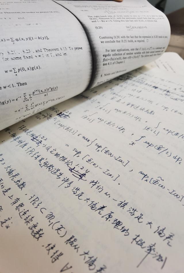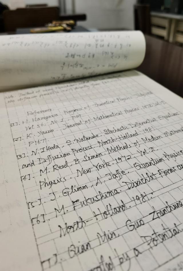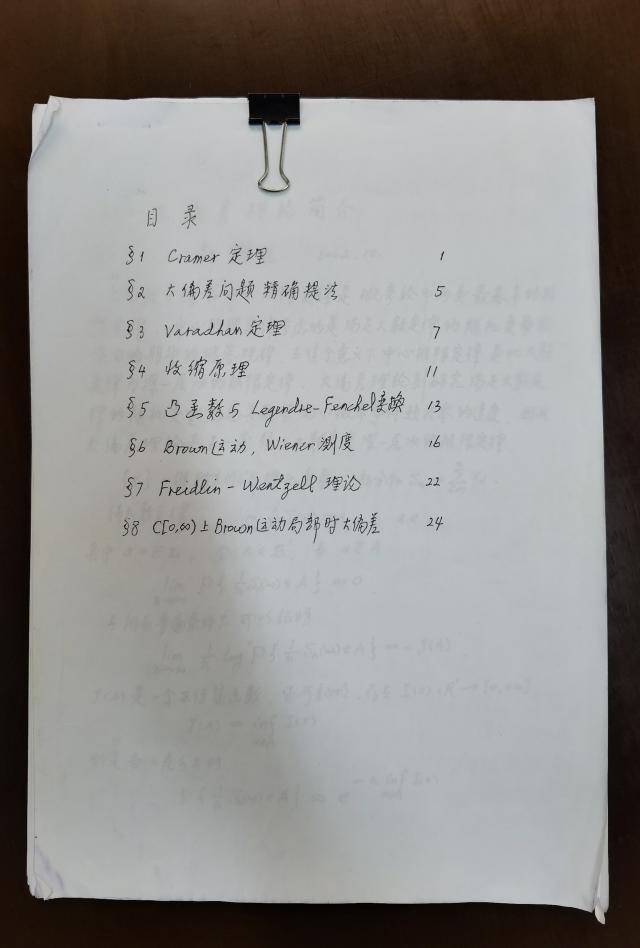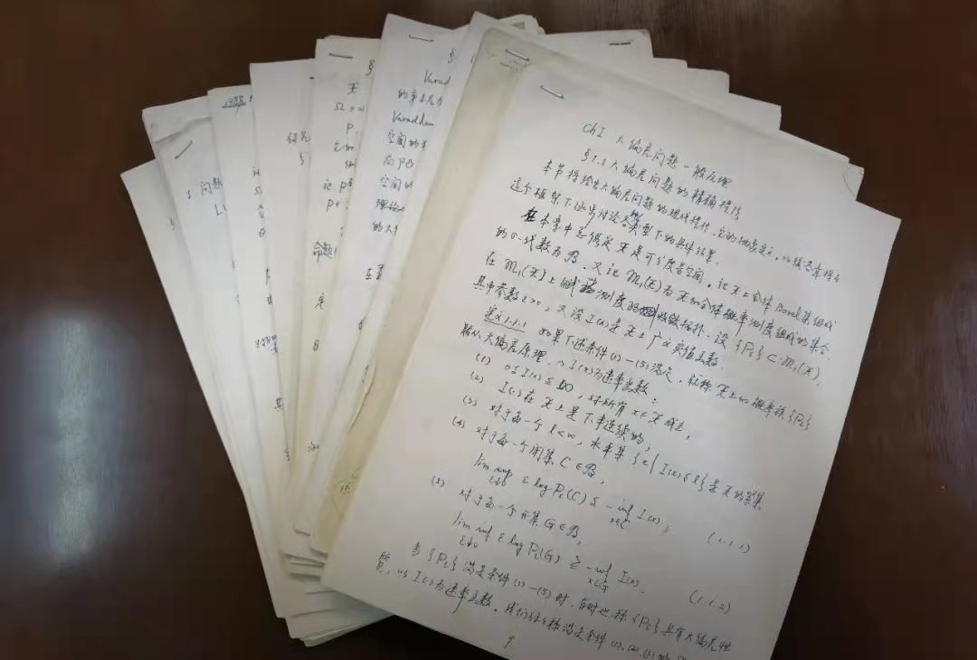 郭懋正教授之手。第一次见到这份笔记时,它们被仔细分成几个章节,装在一个有些破旧的牛皮纸袋中。数百页影印废纸的背面,工整流畅的手迹在泛黄的纸张上流淌。2005年春季前,郭懋正老师将这份手稿交给了当时即将开设《大偏差理论》课程的刘勇教授,郭老师笑言“这是废物利用”的背后,是师者的传承。