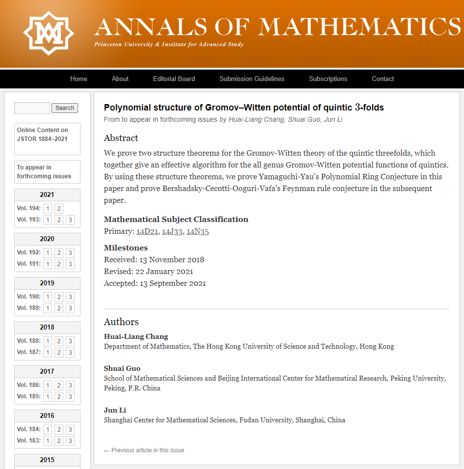郭帅副教授与人合作在BCOV理论的A-模型结构方面取得重要突破。其论文“Polynomial Structure of Gromov–Witten Potential of Quintic 3-folds(五次三维流形的Gromov-Witten势函数的多项式结构)”被国际顶尖数学期刊Annals of Mathematics接收。