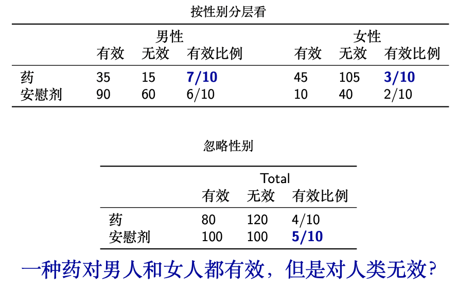 挖掘因果关系是众多科学研究的目标,观察性研究是因果推断的主要数据来源。观察性研究不能进行人为控制的试验,不可避免地存在一些背景变量未被观测,与处理和结果变量都相关的背景变量称为混杂因素,忽略混杂因素会导致因果推断的偏差和决策的错误。例如,教育程度和收入水平都与社会环境和家庭背景等密切相关,忽略这些因素,仅看教育和收入的相关性会得到错误的因果作用。忽略混杂因素甚至会导致悖论,在如下的例子中,按性别(混杂因素)分层来看,一种药对男人和女人都有效,但是忽略性别却发现药反而不如安慰剂有效,这便是著名的Simpson悖论 [2]。